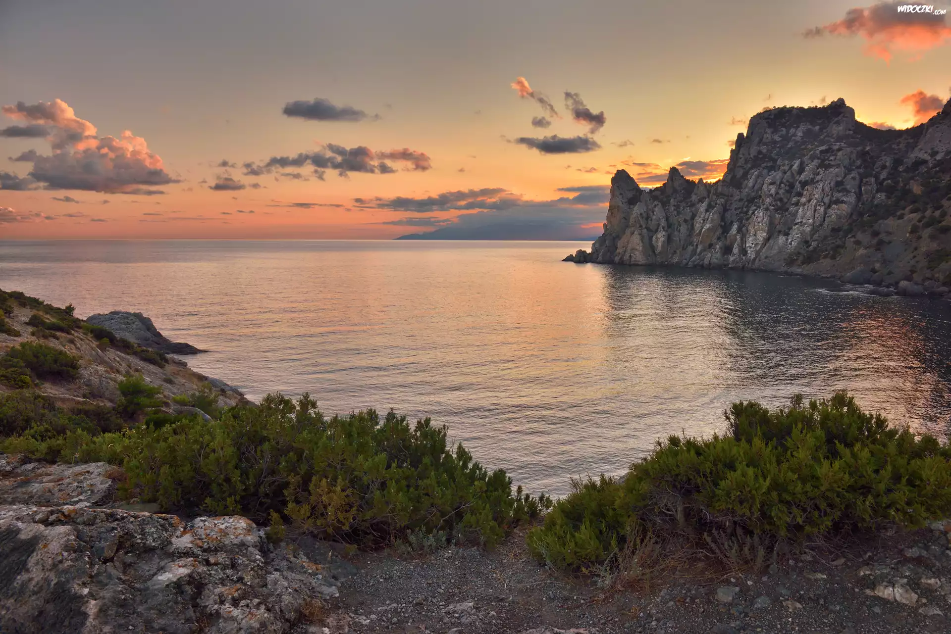 Zdjęcia, Morze, Skały, Drzewa, Chmury, Wschód słońca