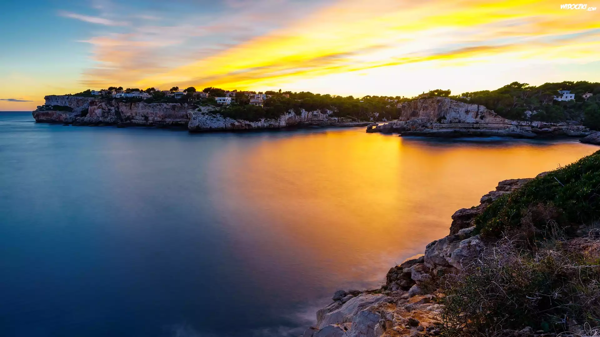Morze, Skały, Drzewa, Domy, Wschód słońca