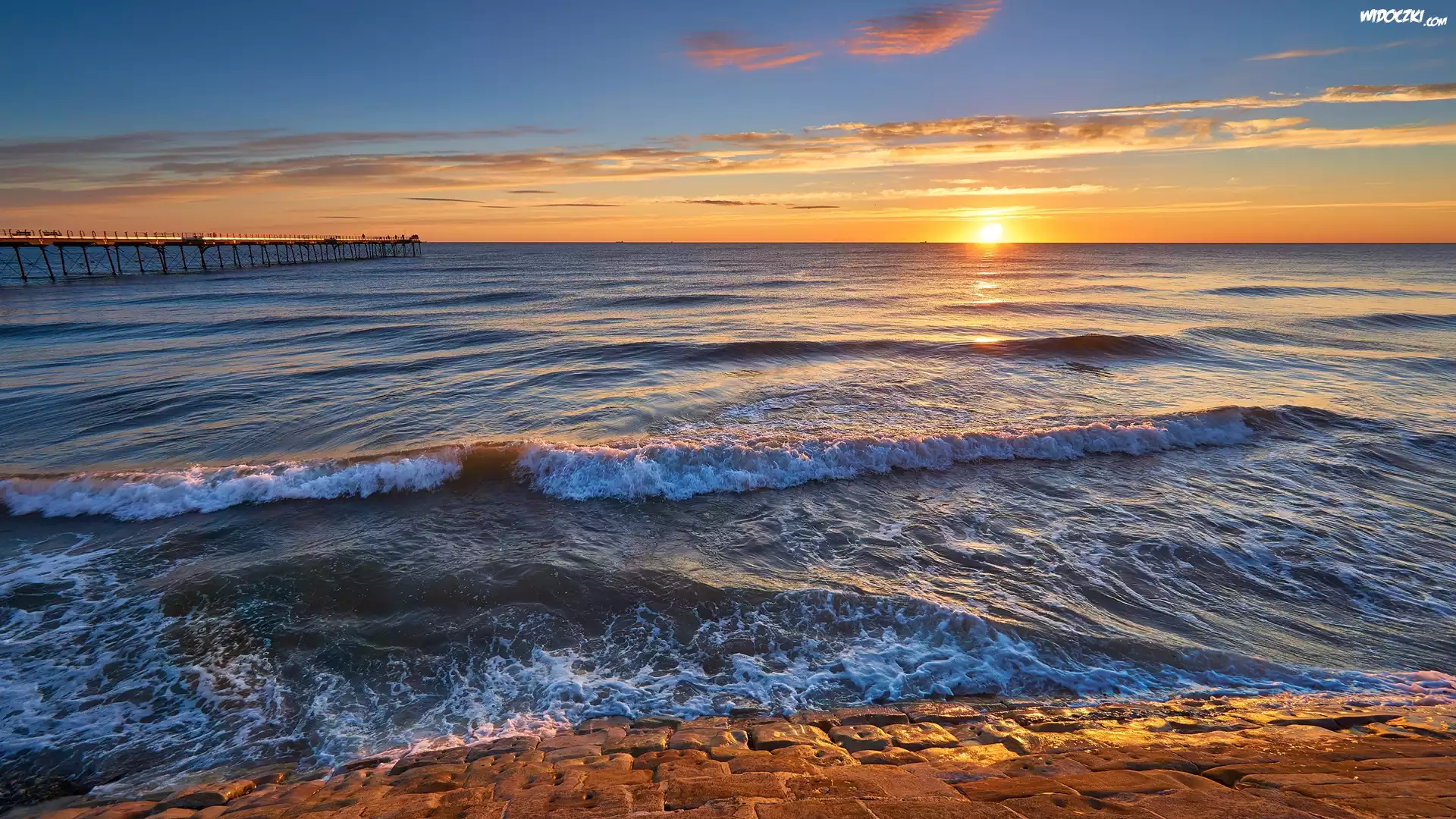 Morze, Molo, Fale, Wschód słońca
