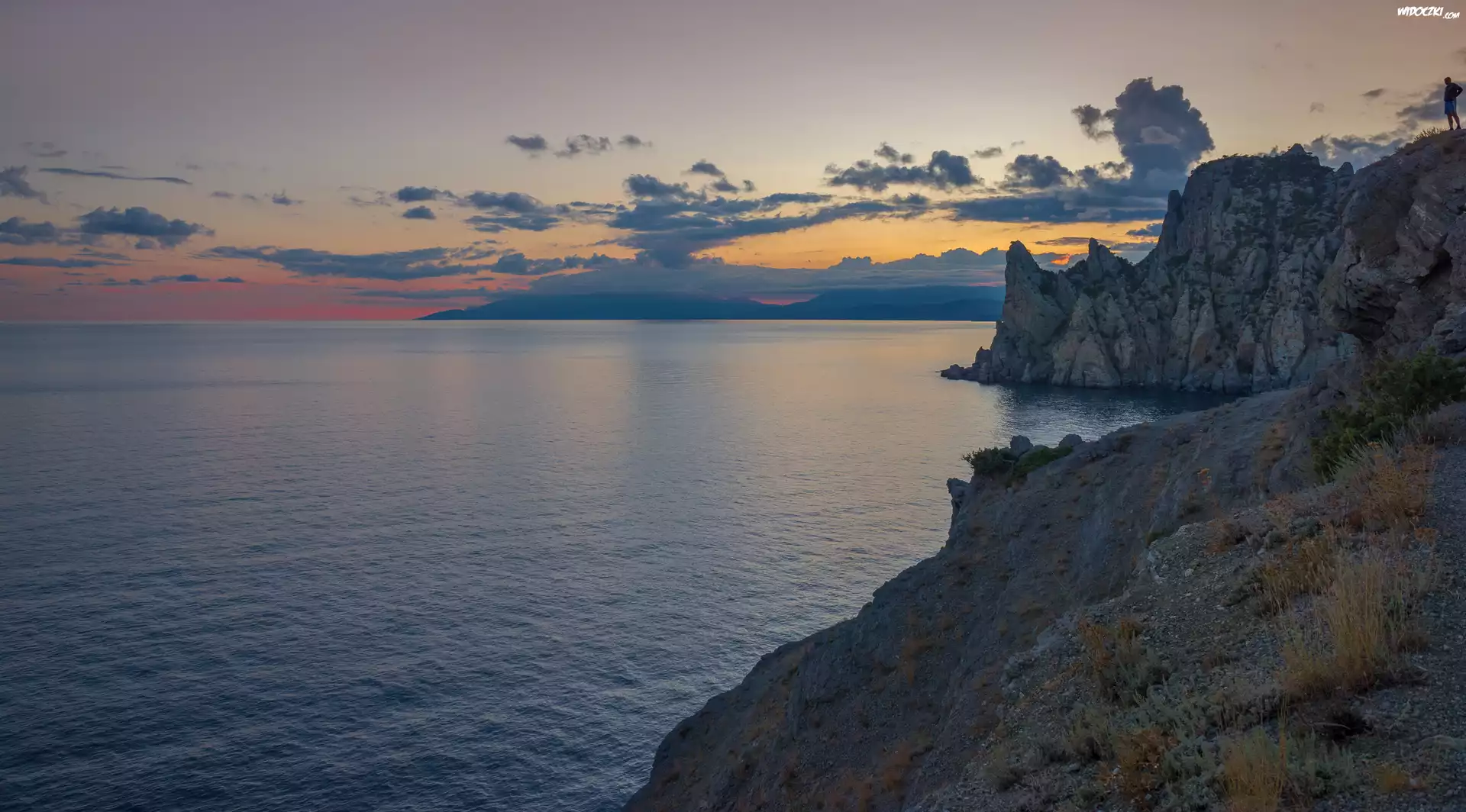 Morze, Skały, Niebo, Chmury, Wschód słońca