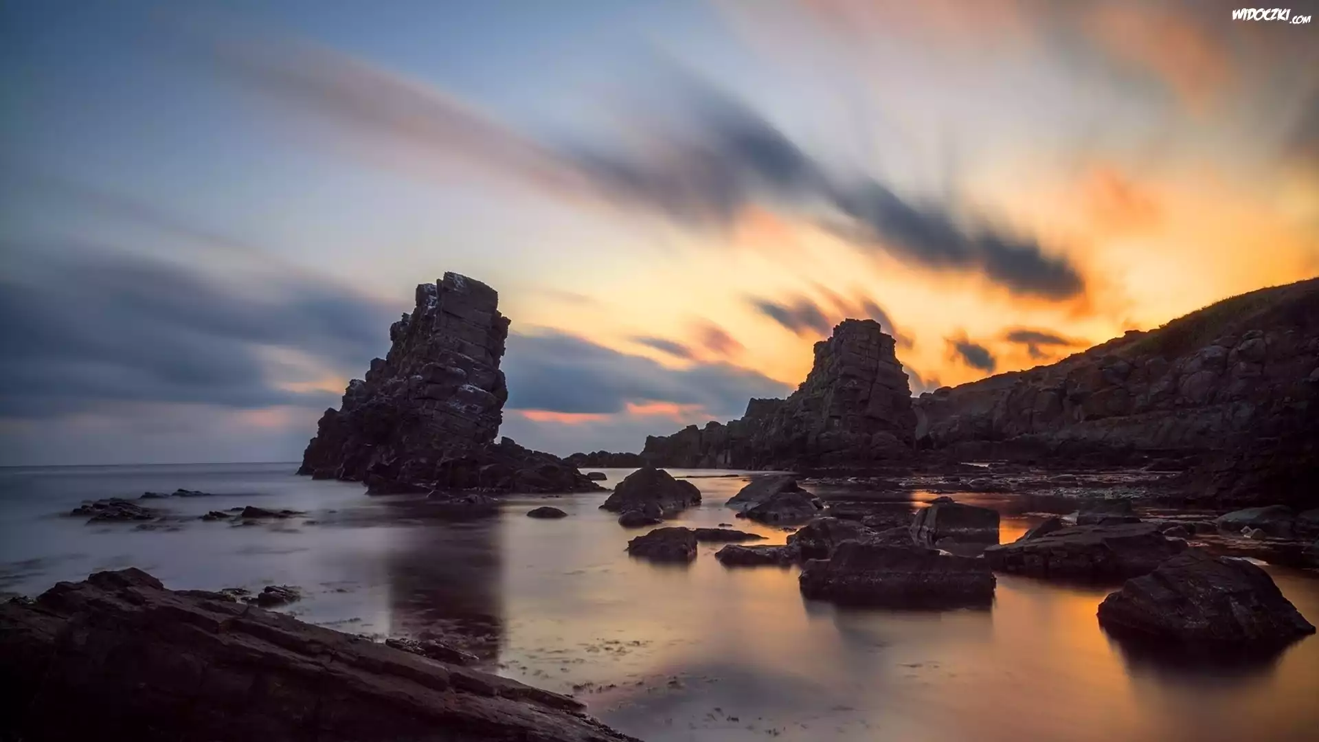 Zdjęcia, Morze, Skały, Niebo, Wschód słońca