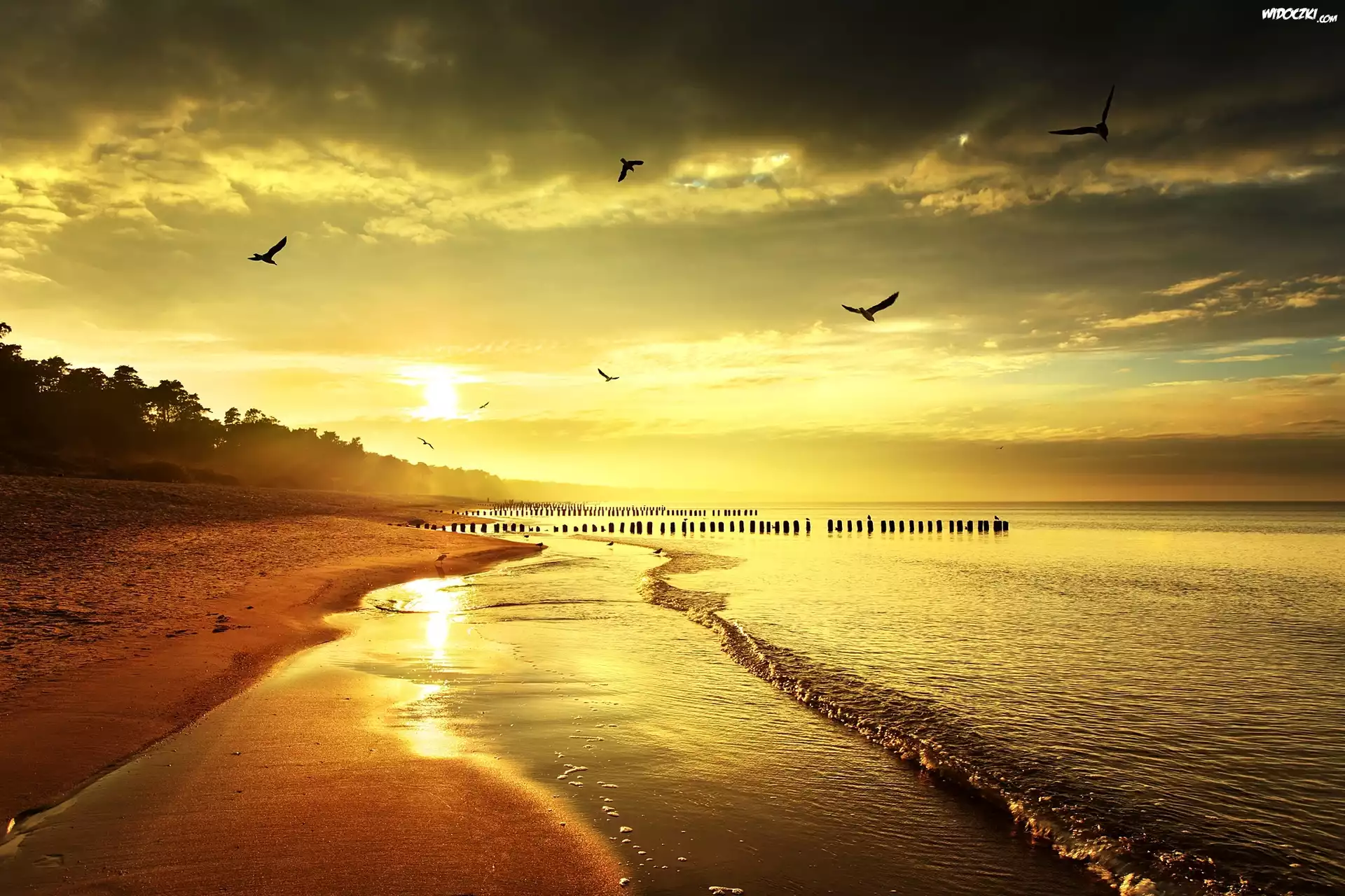 Zdjęcia, Morze, Plaża, Ptaki, Wschód Słońca
