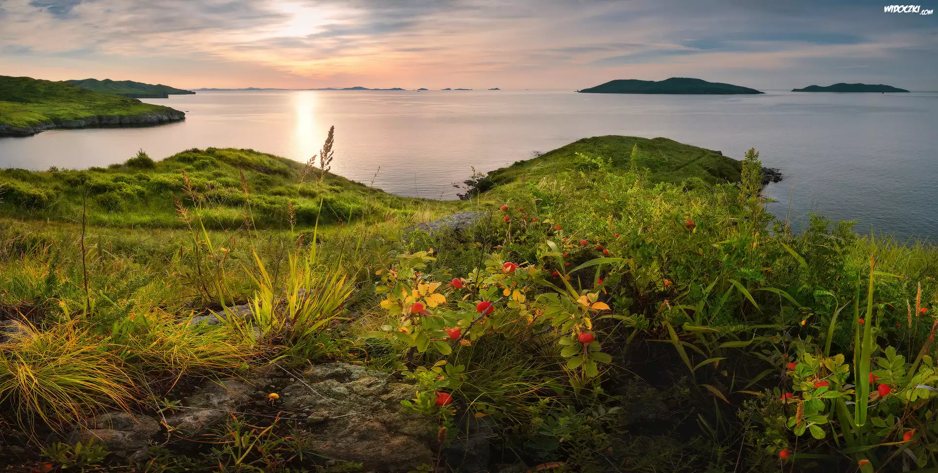 Zdjęcia, Morze, Wybrzeże, Roślinność, Chmury, Wschód słońca