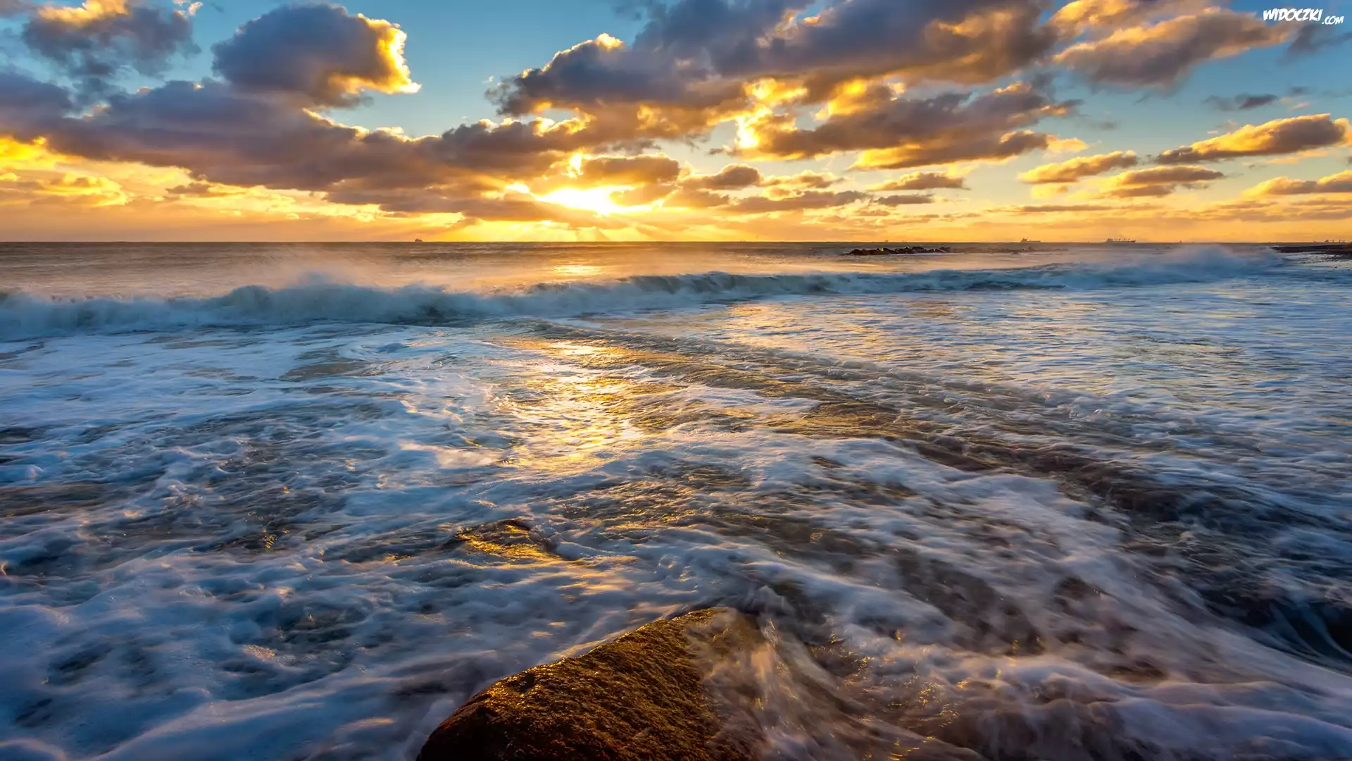Morze, Fale, Skały, Chmury, Wschód słońca