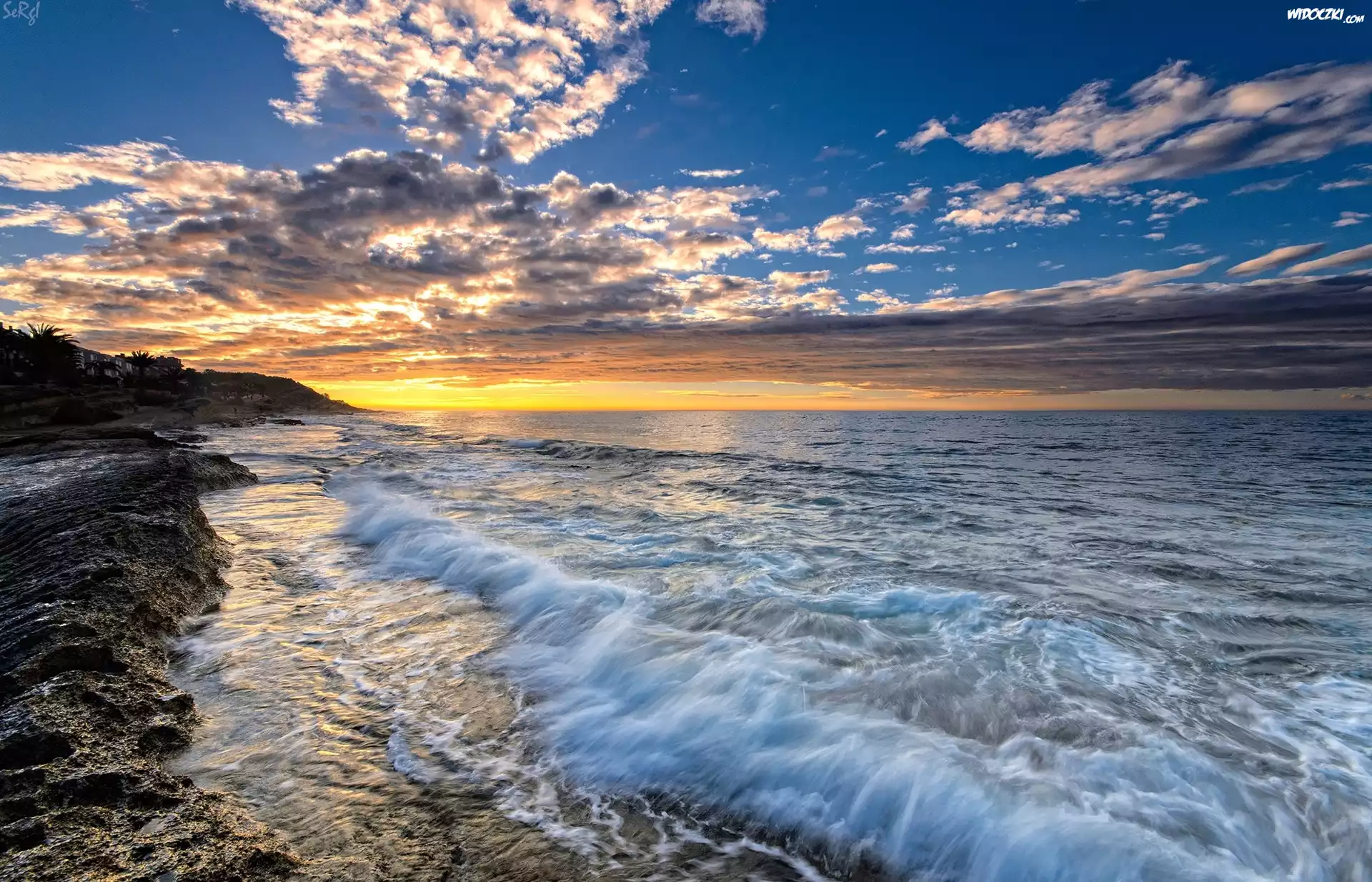 Zdjęcia, Morze, Fale, Wybrzeże, Chmury, Wschód, Słońca