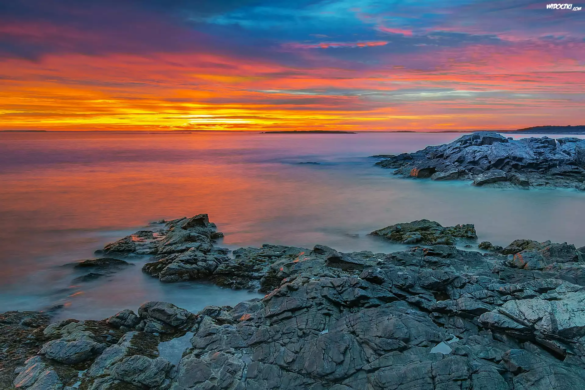 Niebo, Zachód słońca, Morze, Skały, Wybrzeże