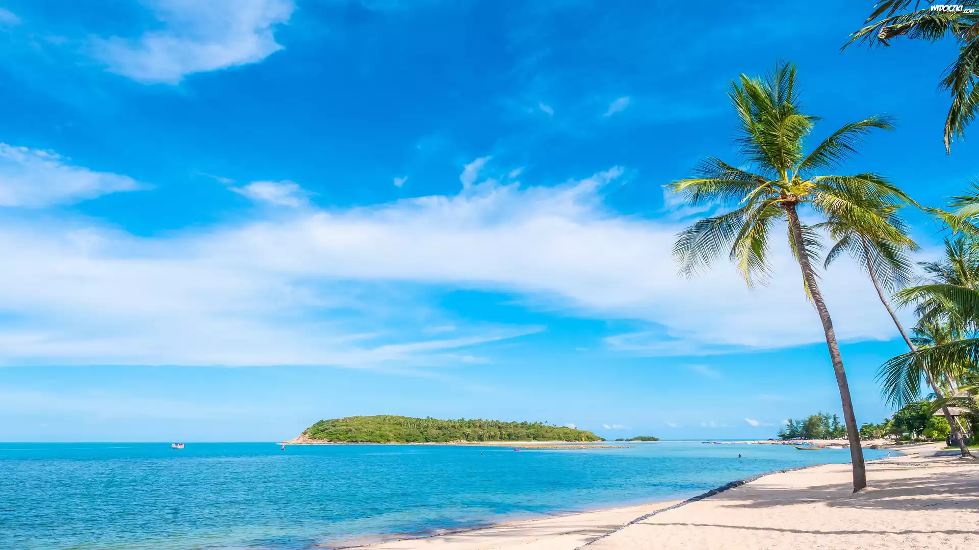 Morze, Plaża, Palmy, Wysepka, Chmury