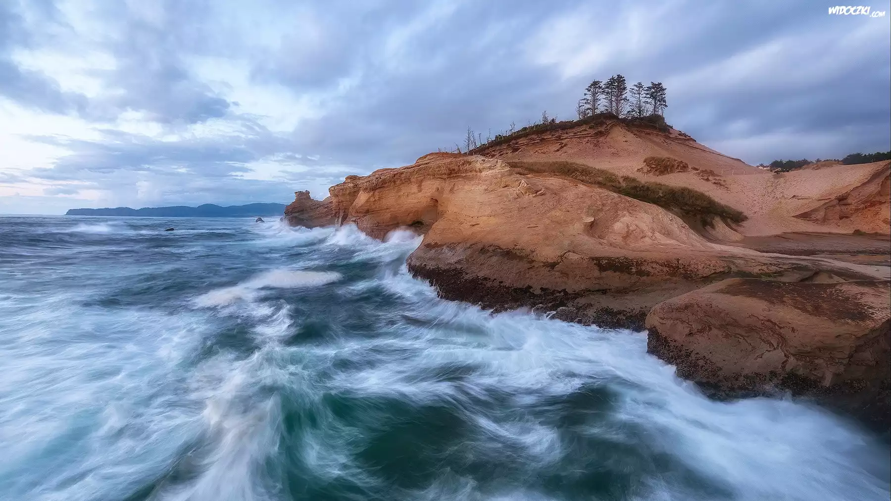 Zdjęcia, Morze, Skały, Wzgórze, Drzewa