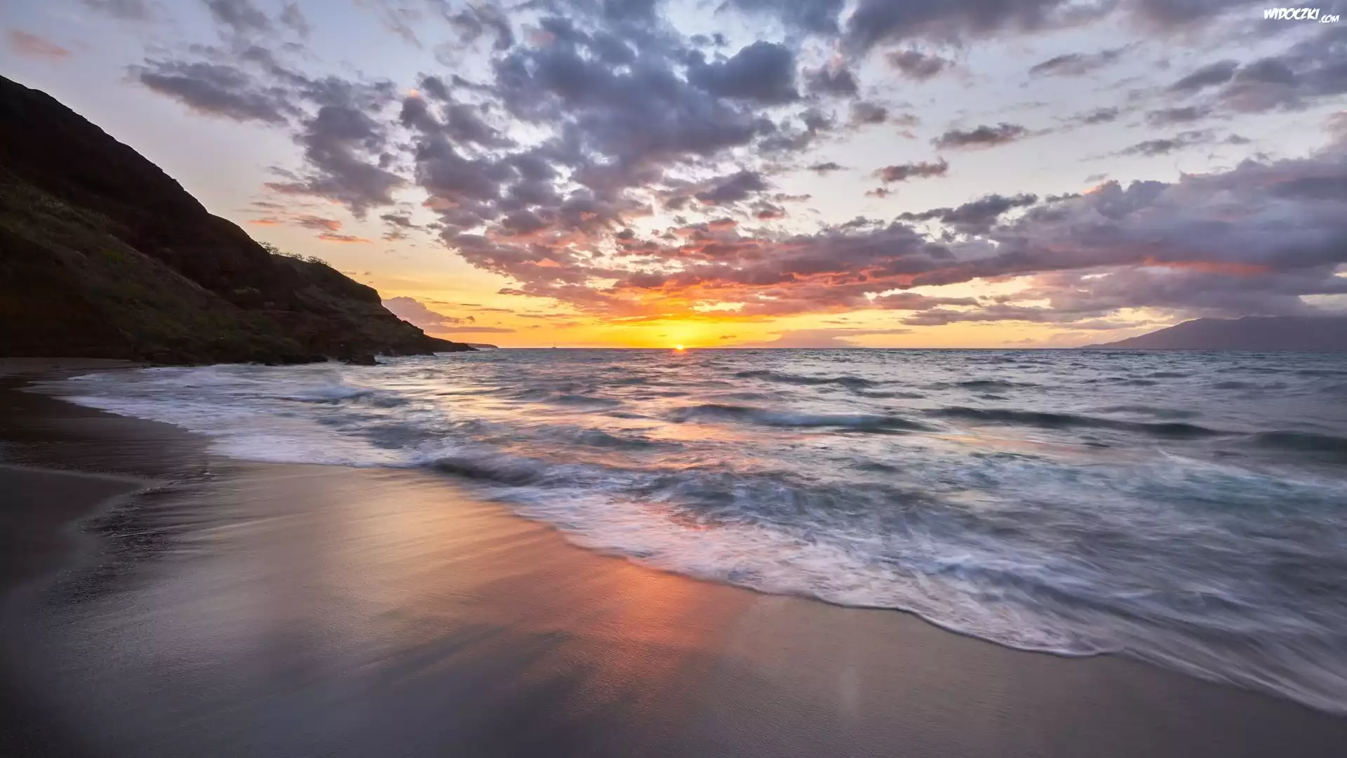 Morze, Fale, Zachód słońca, Wzgórze, Chmury