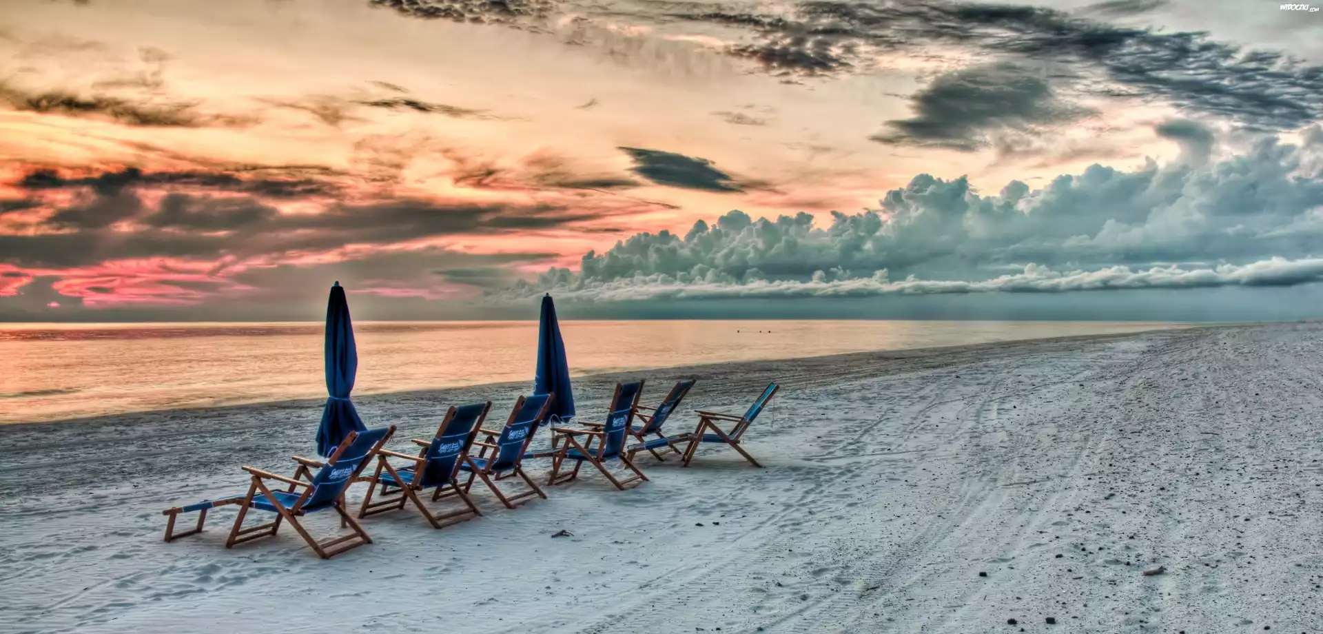 Zdjęcia, Morze, Plaża, Leżaki, Zachmurzone, Niebo, Wakacje