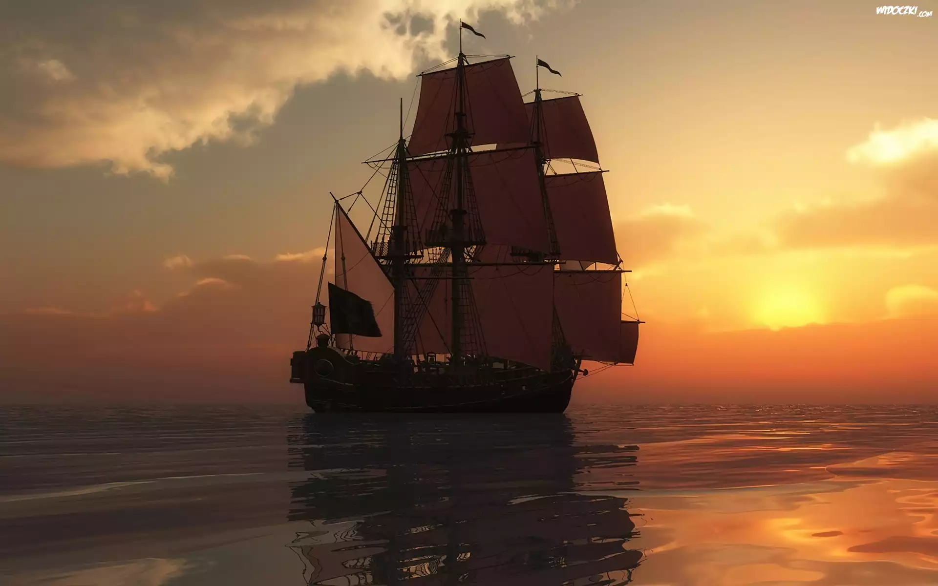 Morze, Żaglowiec, Zachód, Słońca