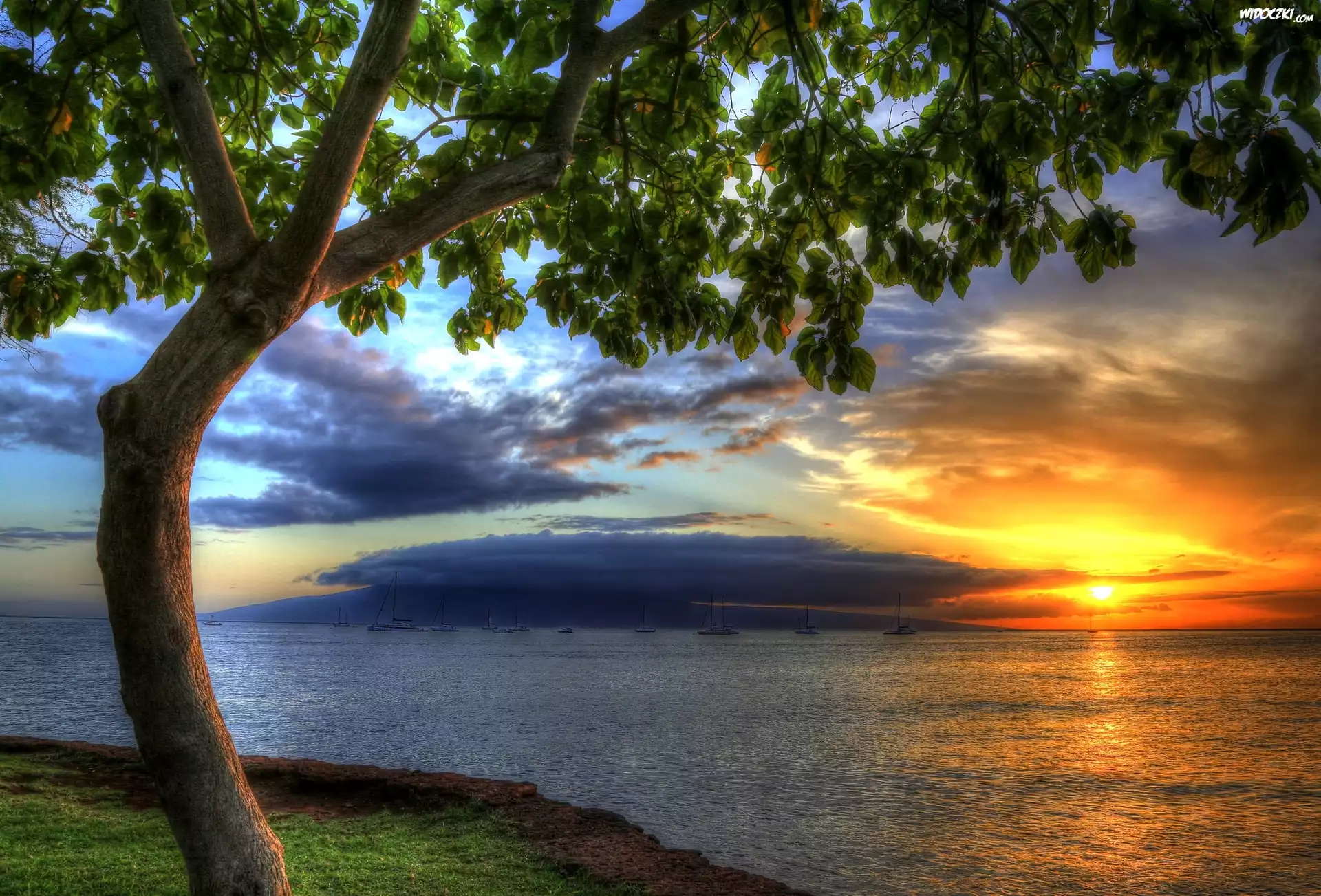 Morze, Drzewo, Żaglówki, Zachód, Słońca