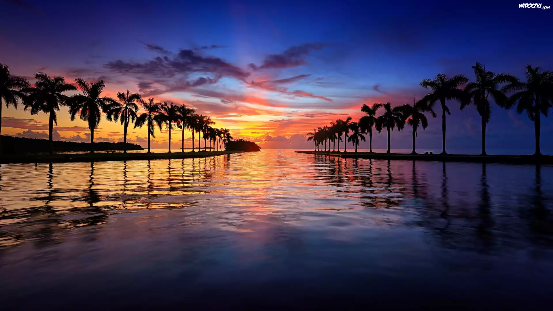 Morze, Palmy, Ławki, Zachód słońca