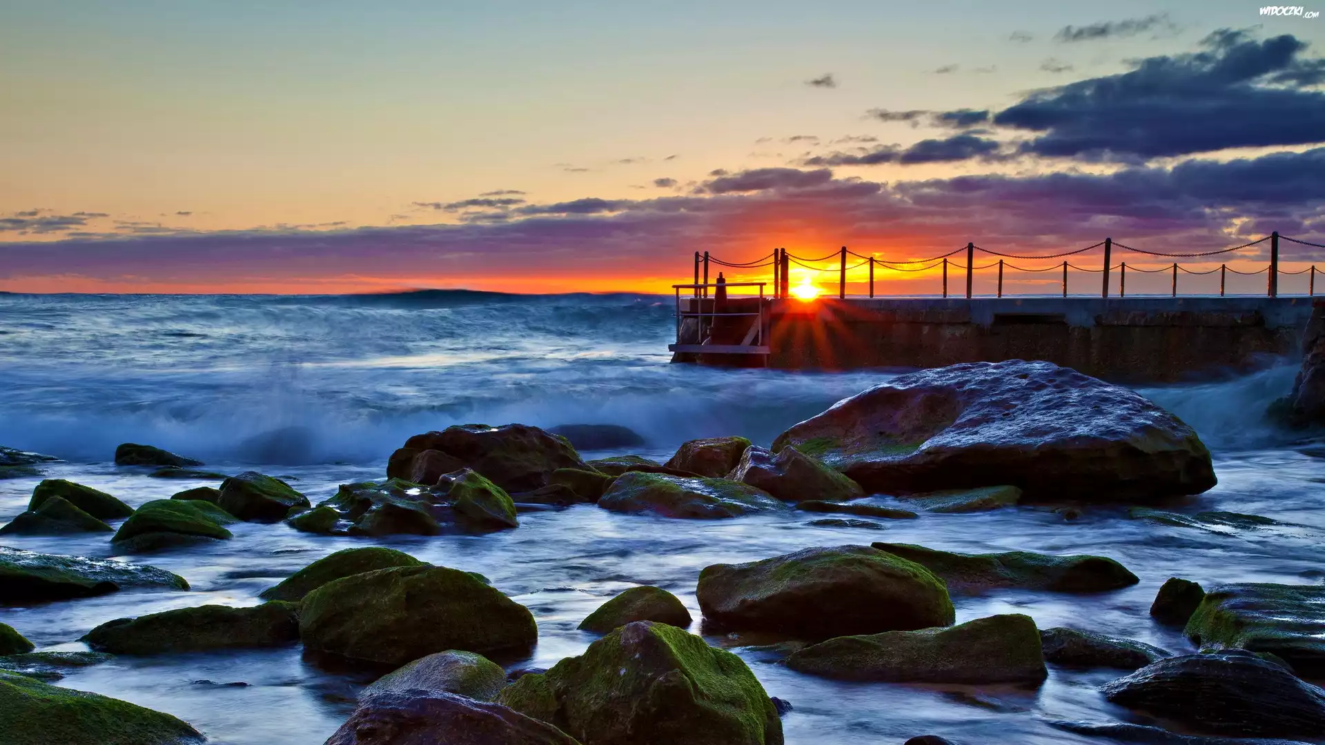 Zdjęcia, Morze, Molo, Brzeg, Kamienie, Zachód, Słońca