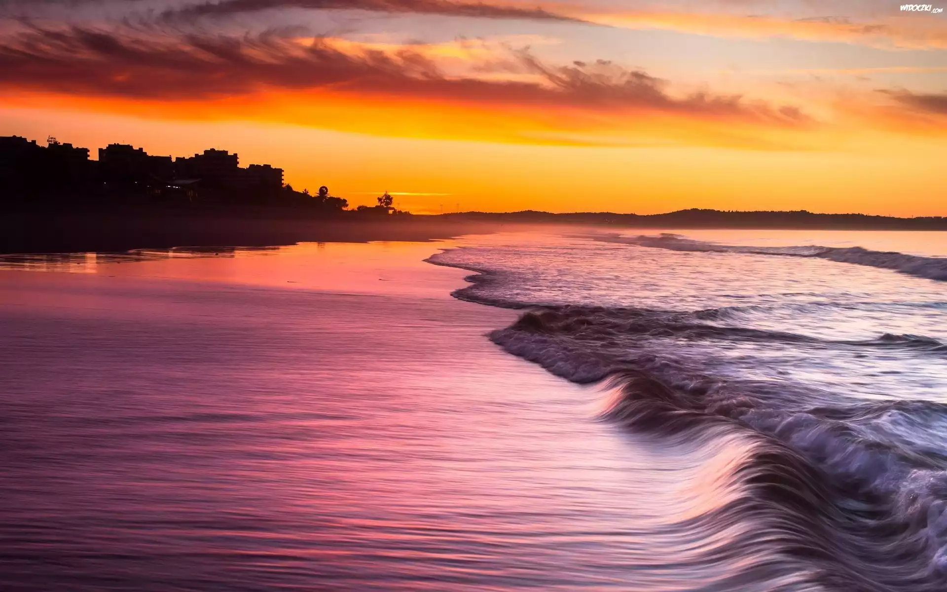Zdjęcia, Morze, Plaża, Budynki, Zachód Słońca