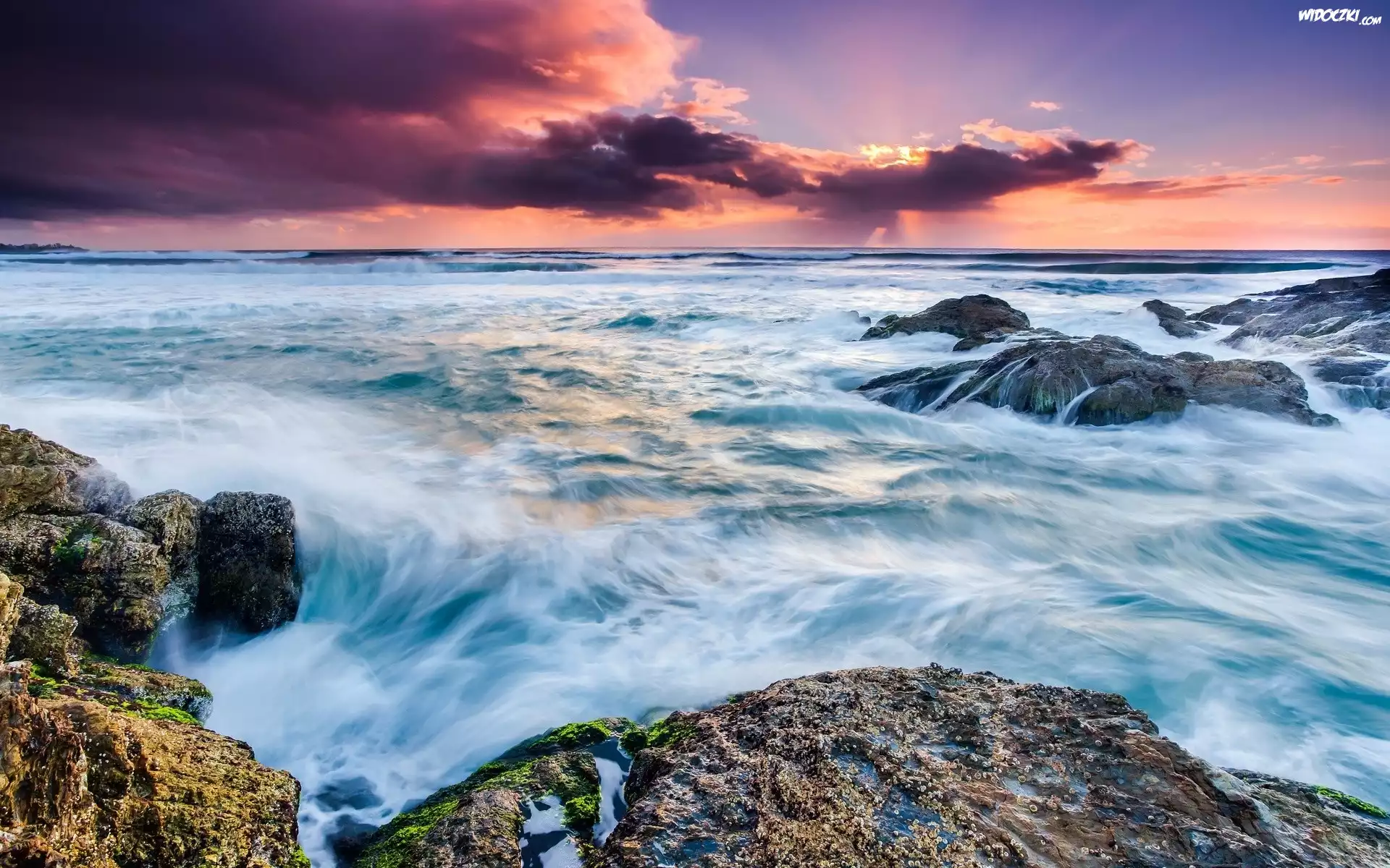 Morze, Skały, Chmury, Zachód słońca