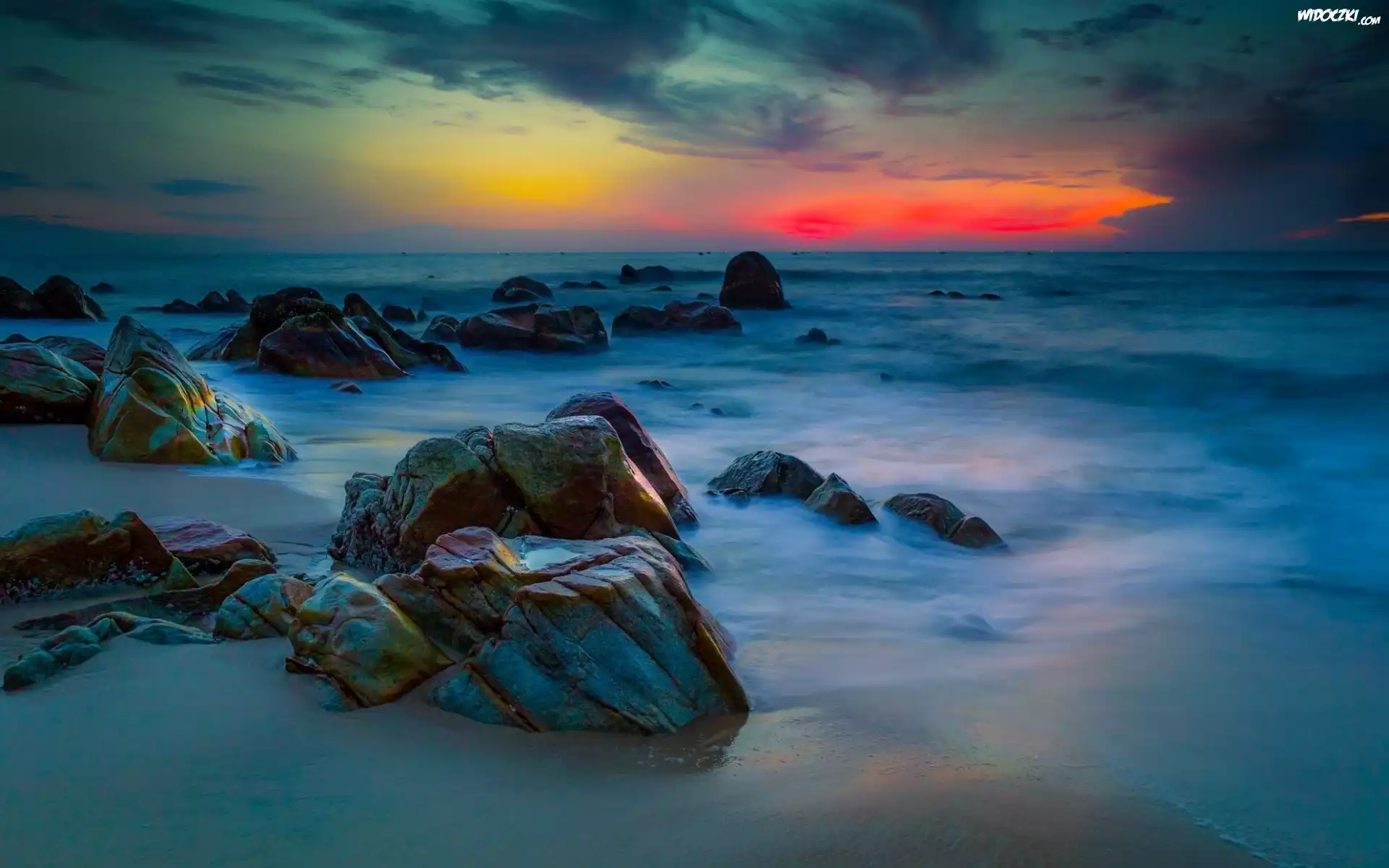 Zdjęcia, Morze, Skały, Chmury, Zachód, Słońca