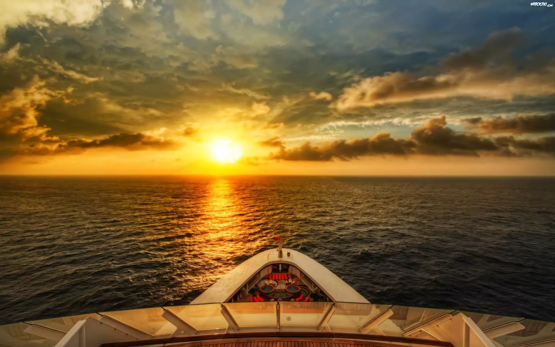 Zdjęcia, Morze, Statek, Chmury, Zachód, Słońca