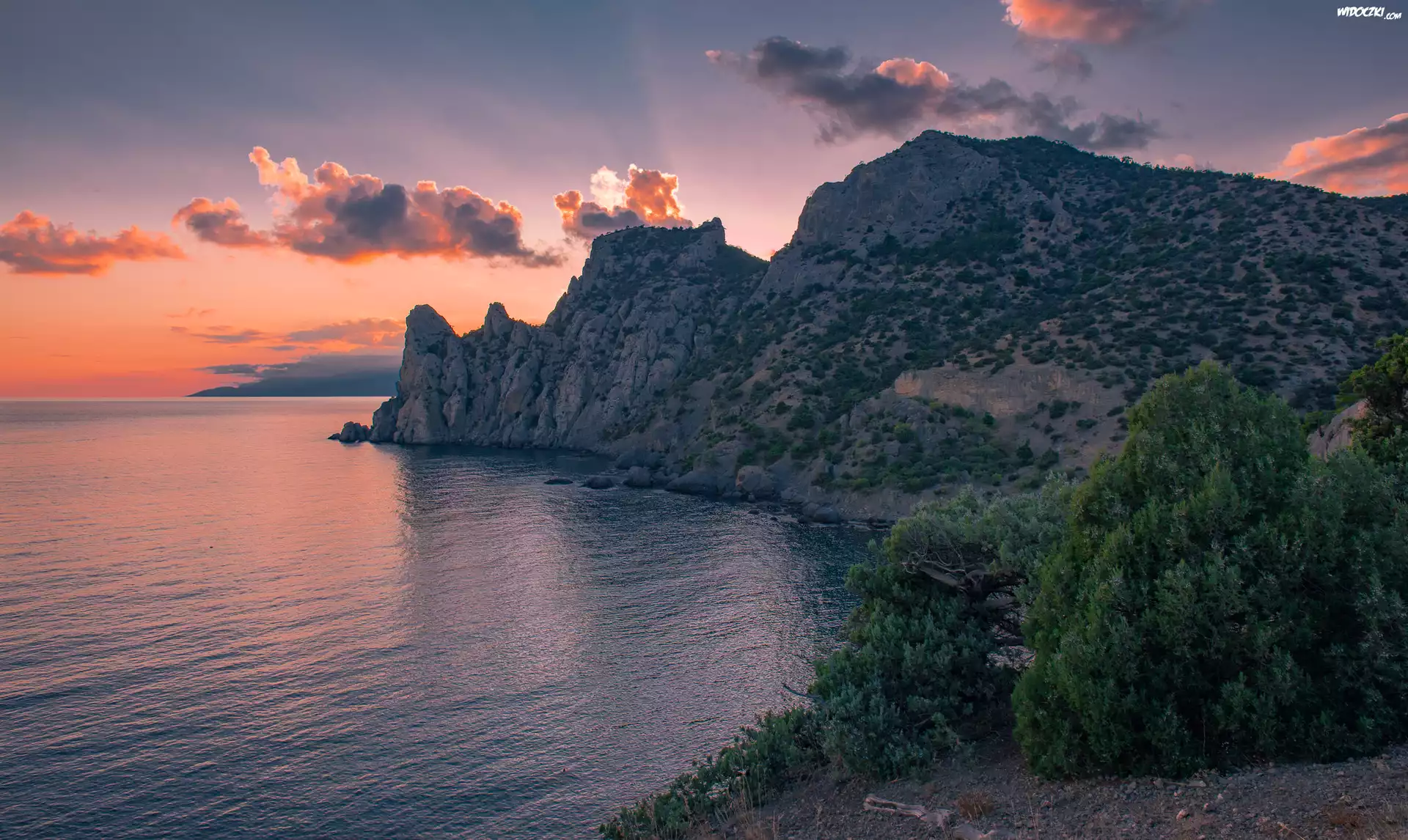 Zdjęcia, Morze, Skały, Drzewa, Chmury, Zachód słońca