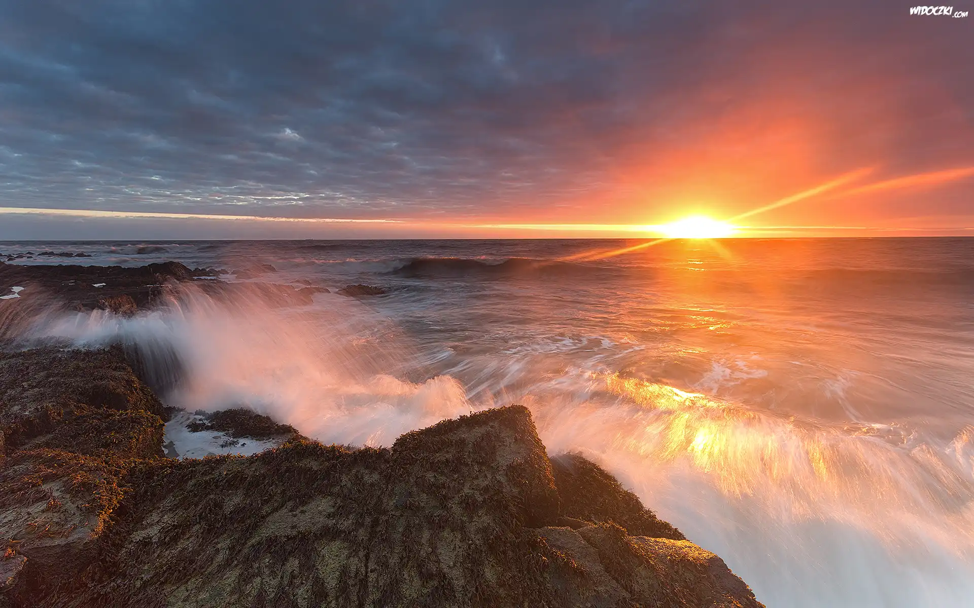 Zdjęcia, Morze, Skały, Fale, Zachód słońca
