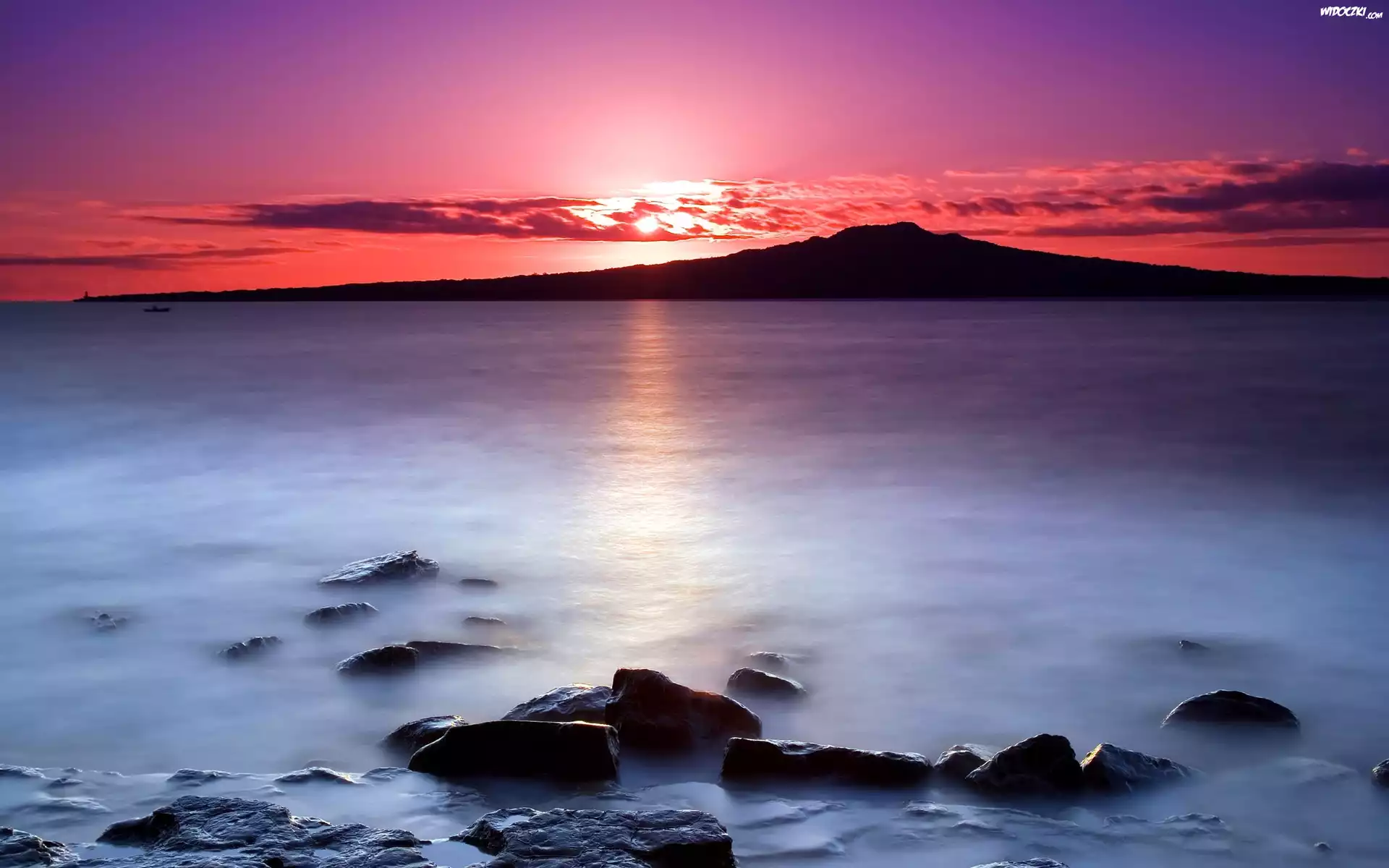 Zdjęcia, Morze, Kamienie, Góry, Zachód Słońca