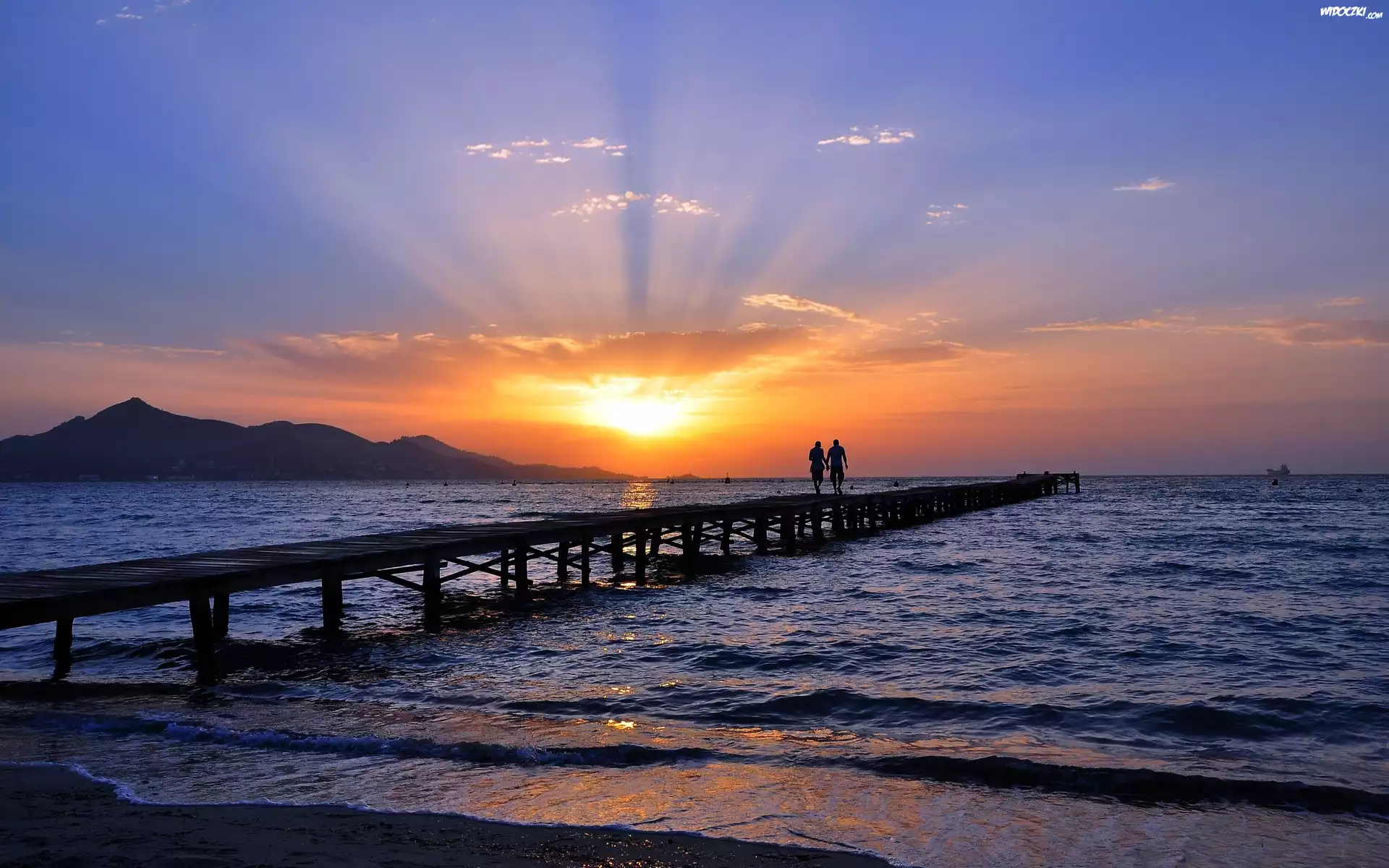 Morze, Pomost, Góry, Ludzie, Zachód, Słońca