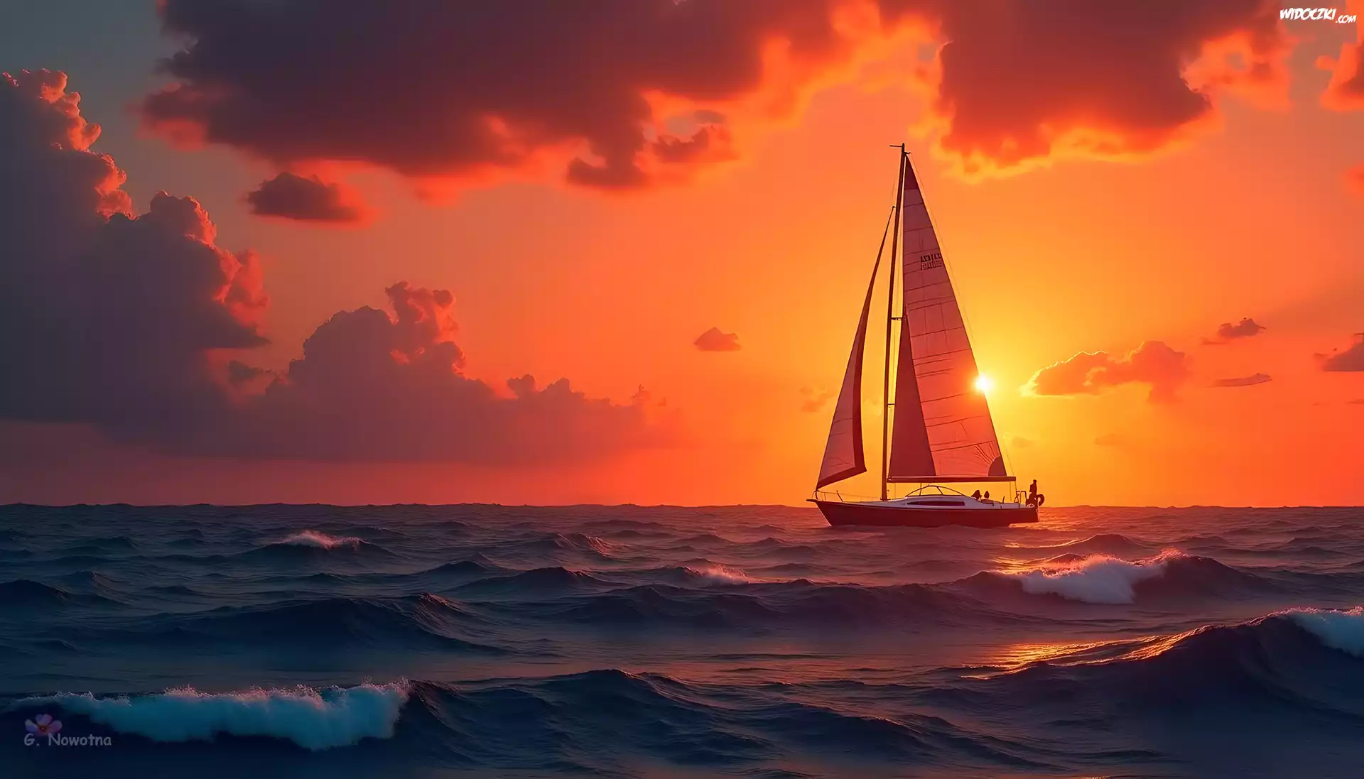 Zdjęcia, Żaglówka, Morze, Zachód słońca, Grafika