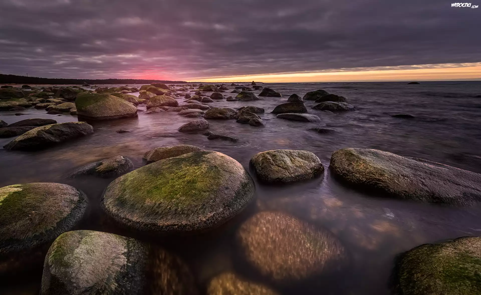 Zdjęcia, Morze, Omszałe, Kamienie, Brzeg, Zachód słońca