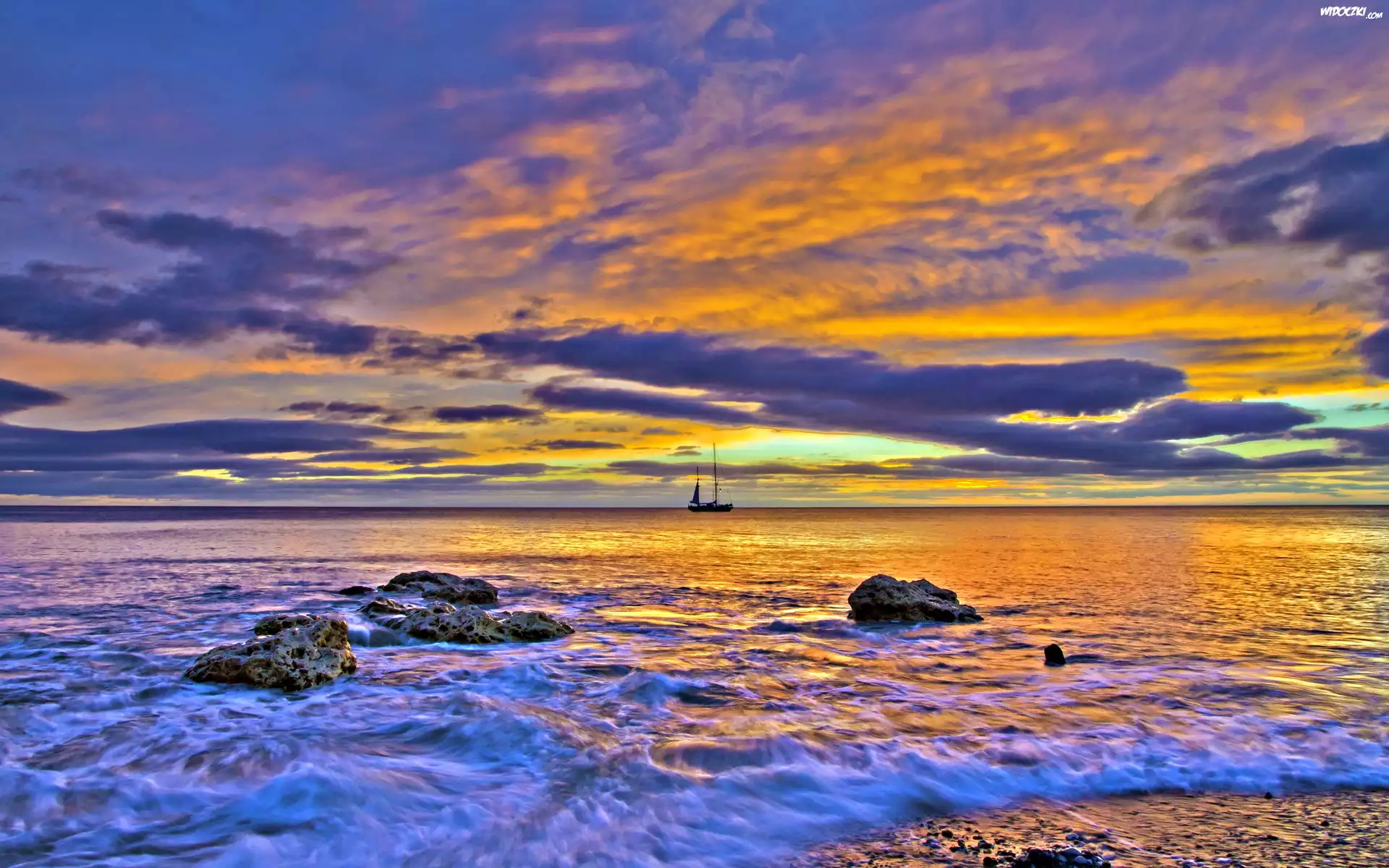 Zdjęcia, Morze, Brzeg, Kamienie, Zachód, Słońca