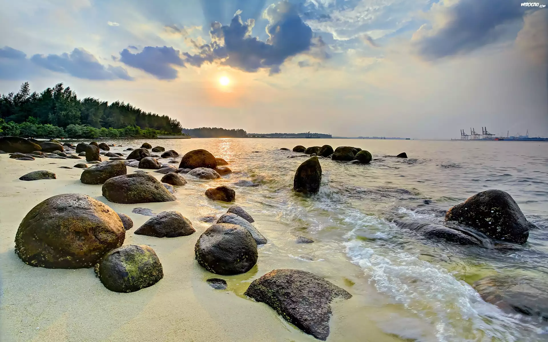 Zdjęcia, Morze, Brzeg, Kamienie, Zachód, Słońca
