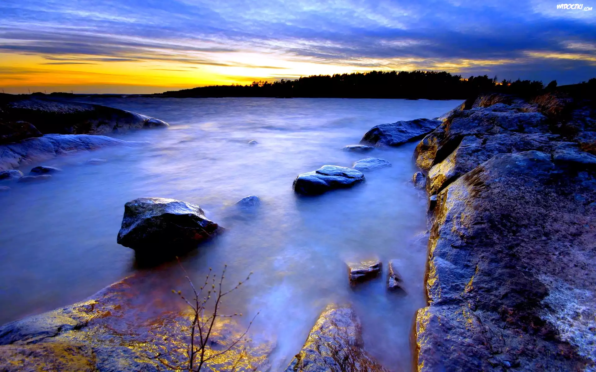Zdjęcia, Morze, Brzeg, Kamienie, Zachód, Słońca