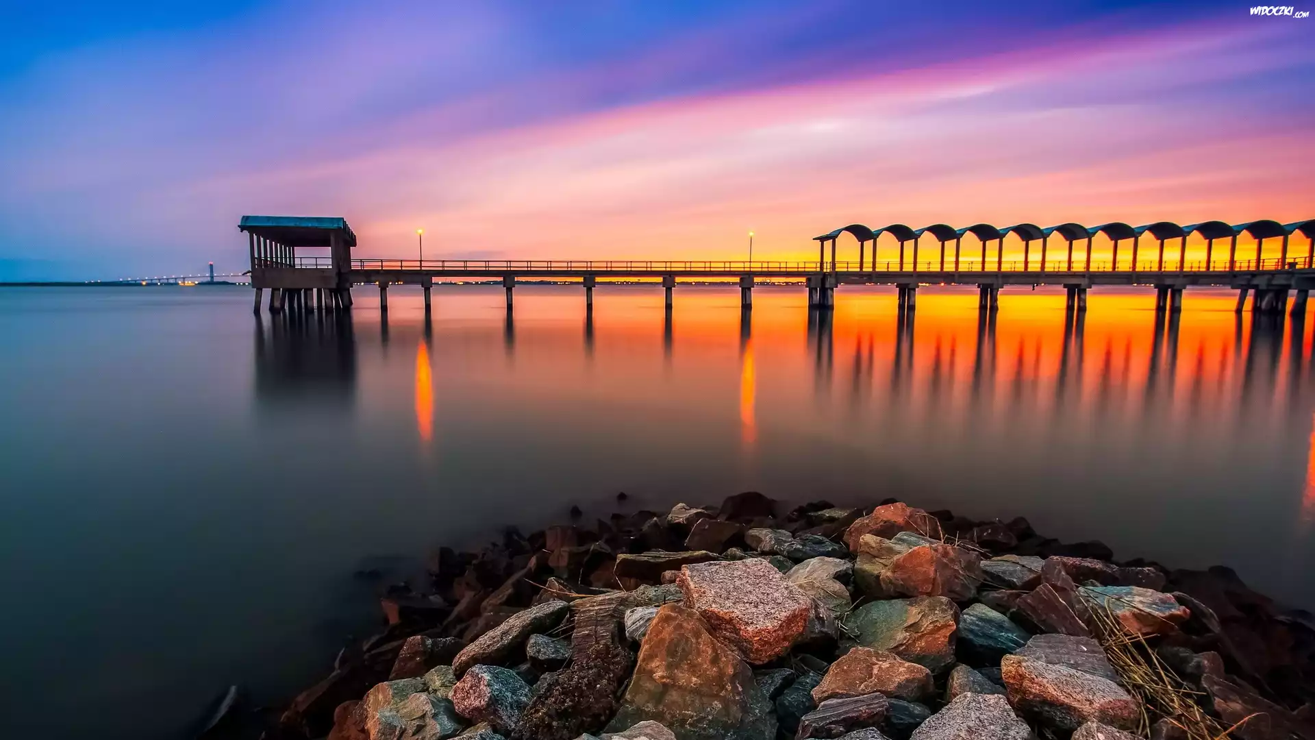 Zdjęcia, Morze, Molo, Kamienie, Zachód Słońca