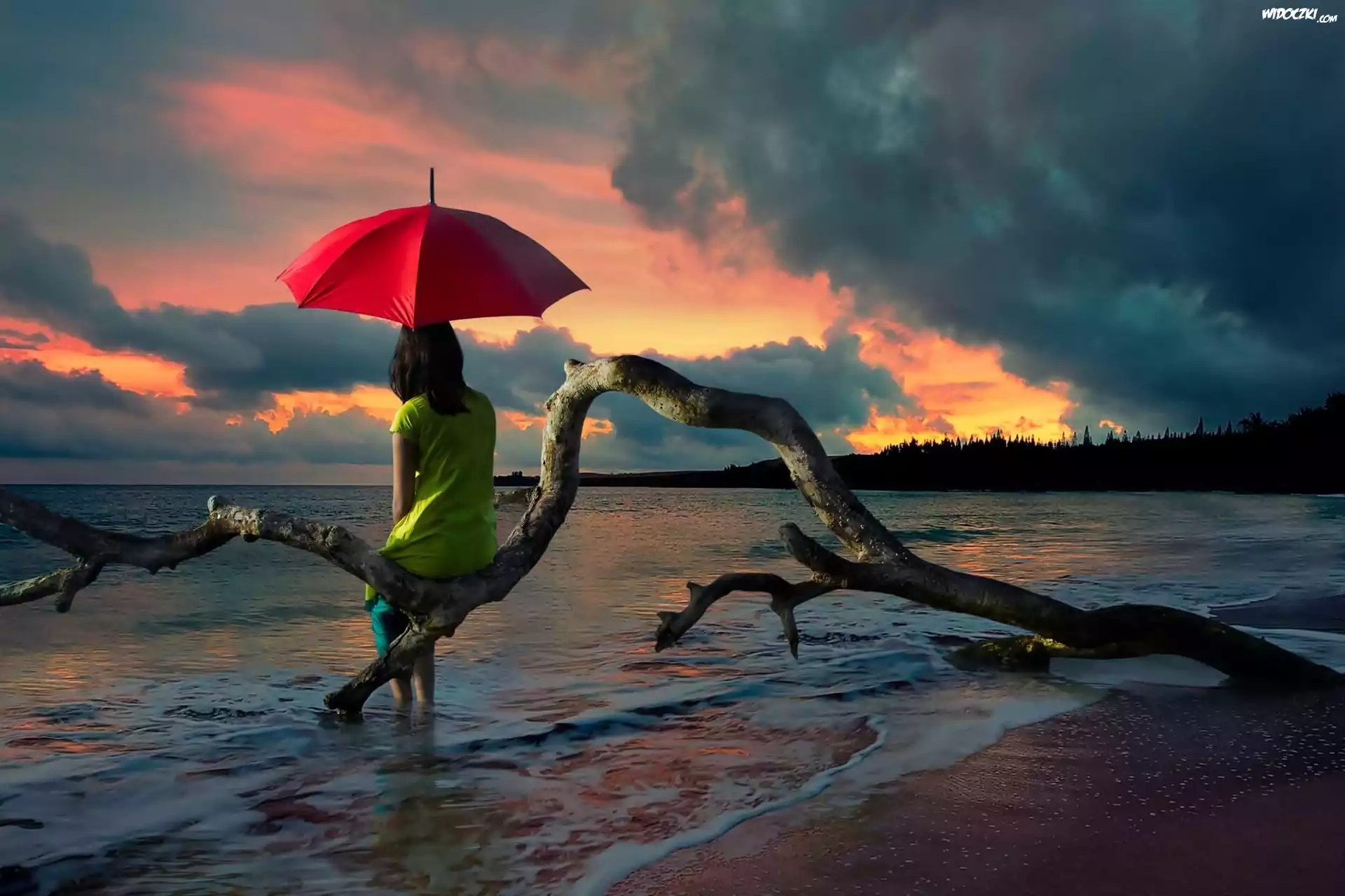 Zdjęcia, Morze, Plaża, Kobieta, Parasolka, Zachód, Słońca