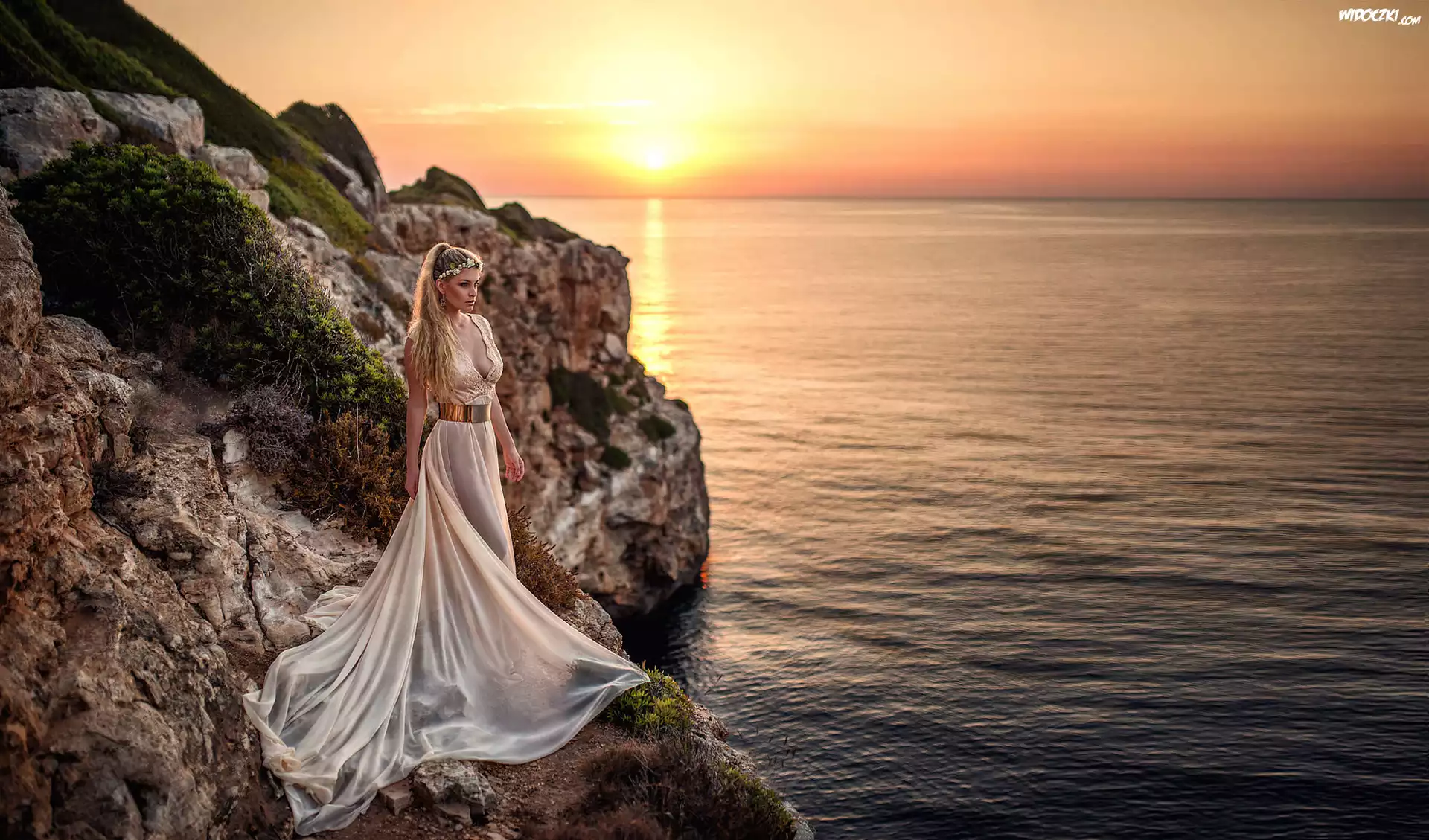 Zdjęcia, Morze, Skała, Kobieta, Zachód, Słońca