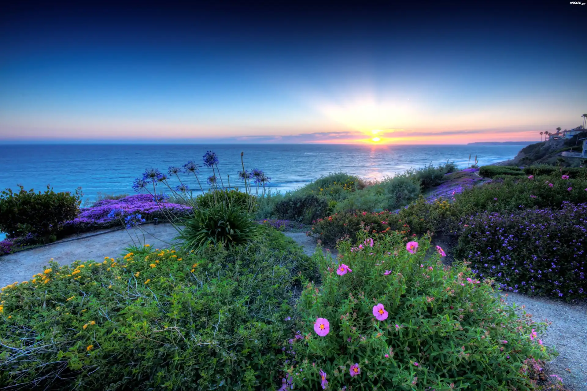 Morze, Wybrzeże, Kwiatki, Zachód Słońca