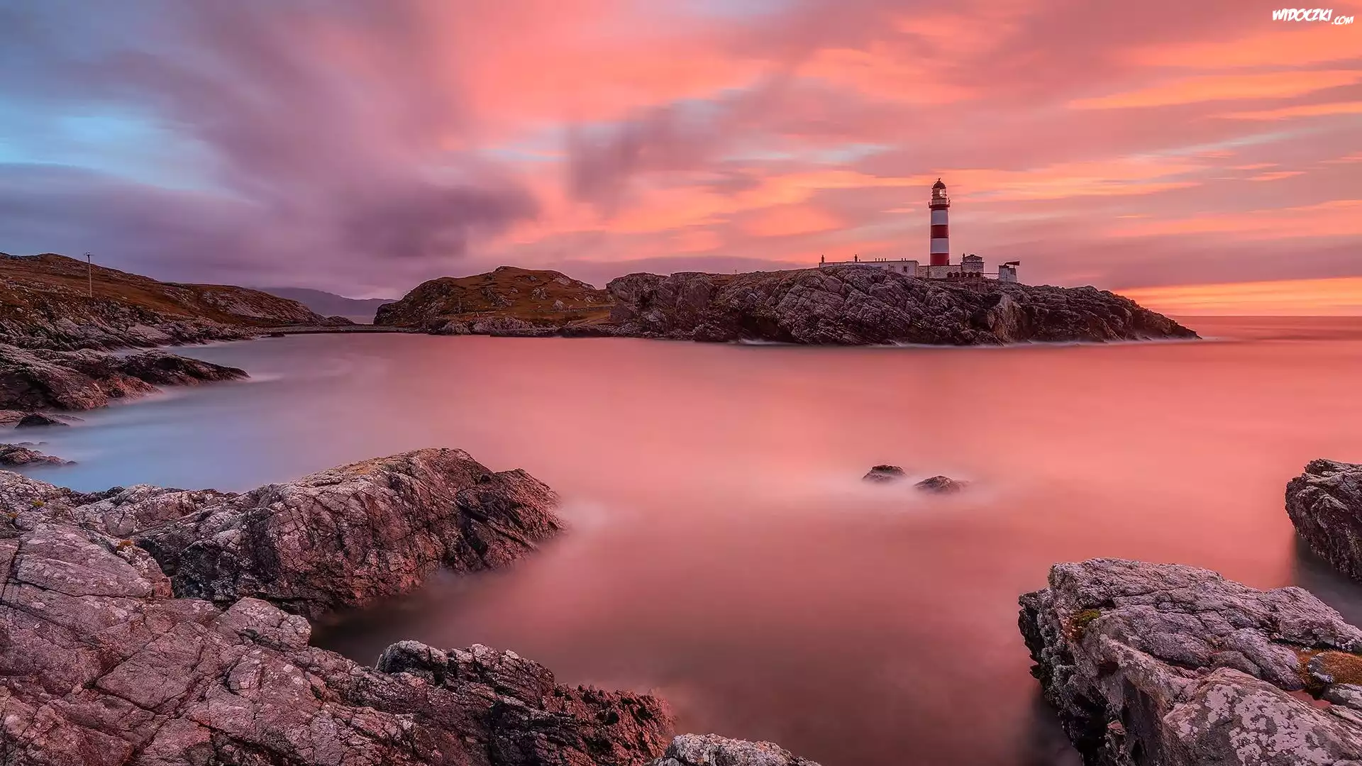 Zdjęcia, Morze, Skały, Latarnia morska, Zachód słońca