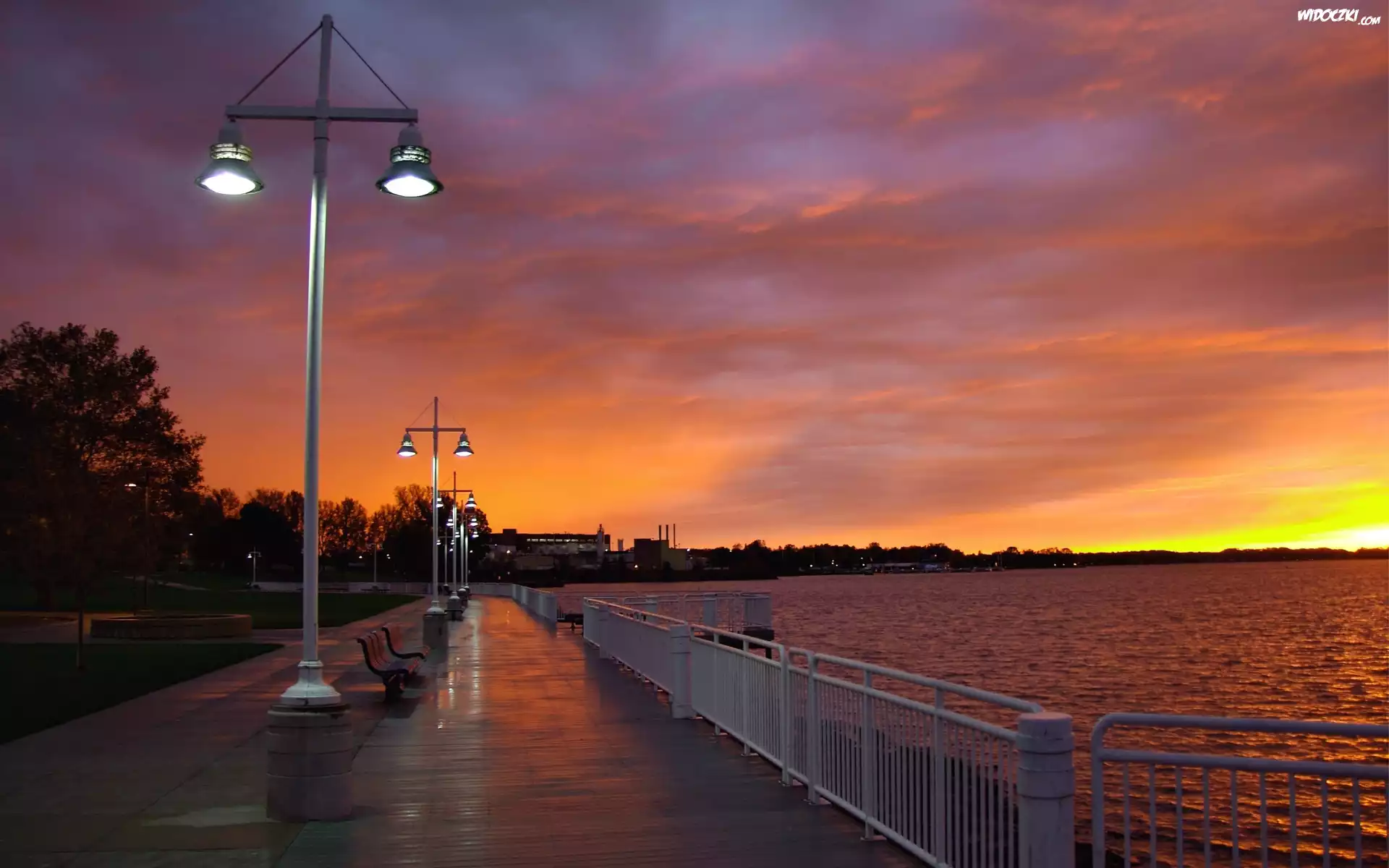 Zdjęcia, Morze, Miasto, Latarnie, Zachód, Słońca