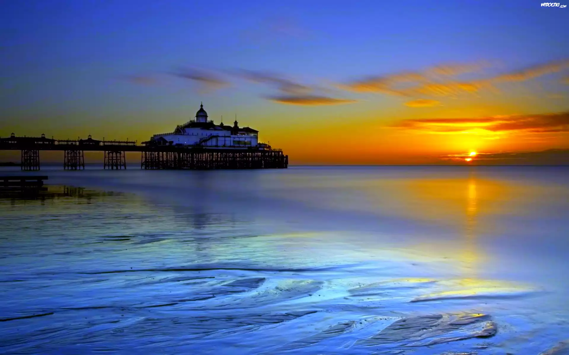 Morze, Plaża, Molo, Dom, Zachód, Słońca