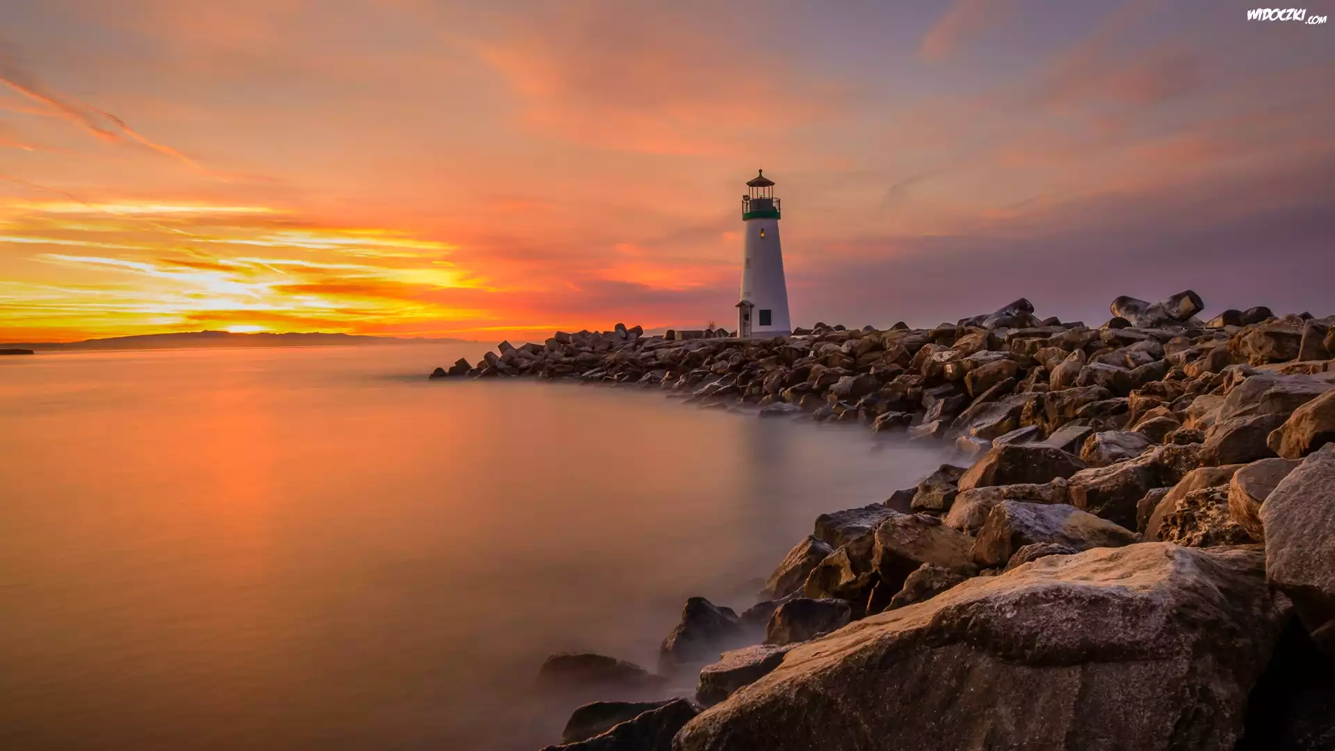 Zdjęcia, Morze, Latarnia morska, Kamienie, Zachód słońca