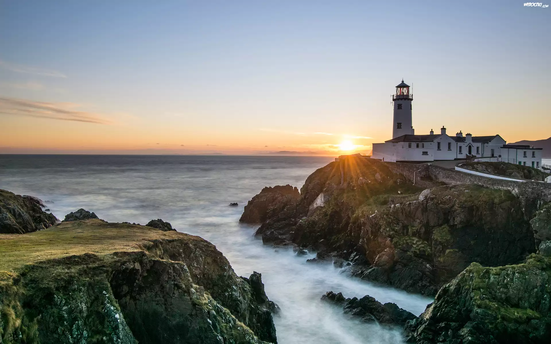Morze, Latarnia morska, Skały, Zachód słońca