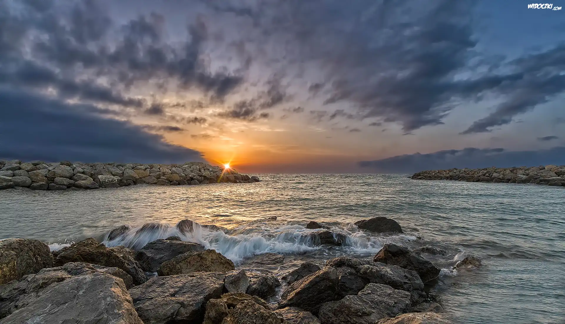 Zdjęcia, Morze, Skaly, Niebo, Chmury, Zachod, Slonca