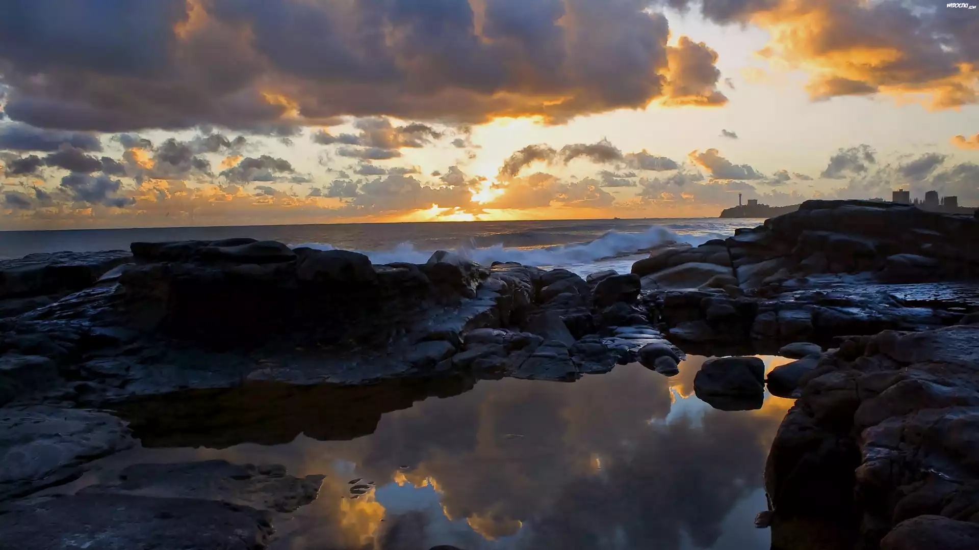 Morze, Skały, Niebo, Zachód, Słońca