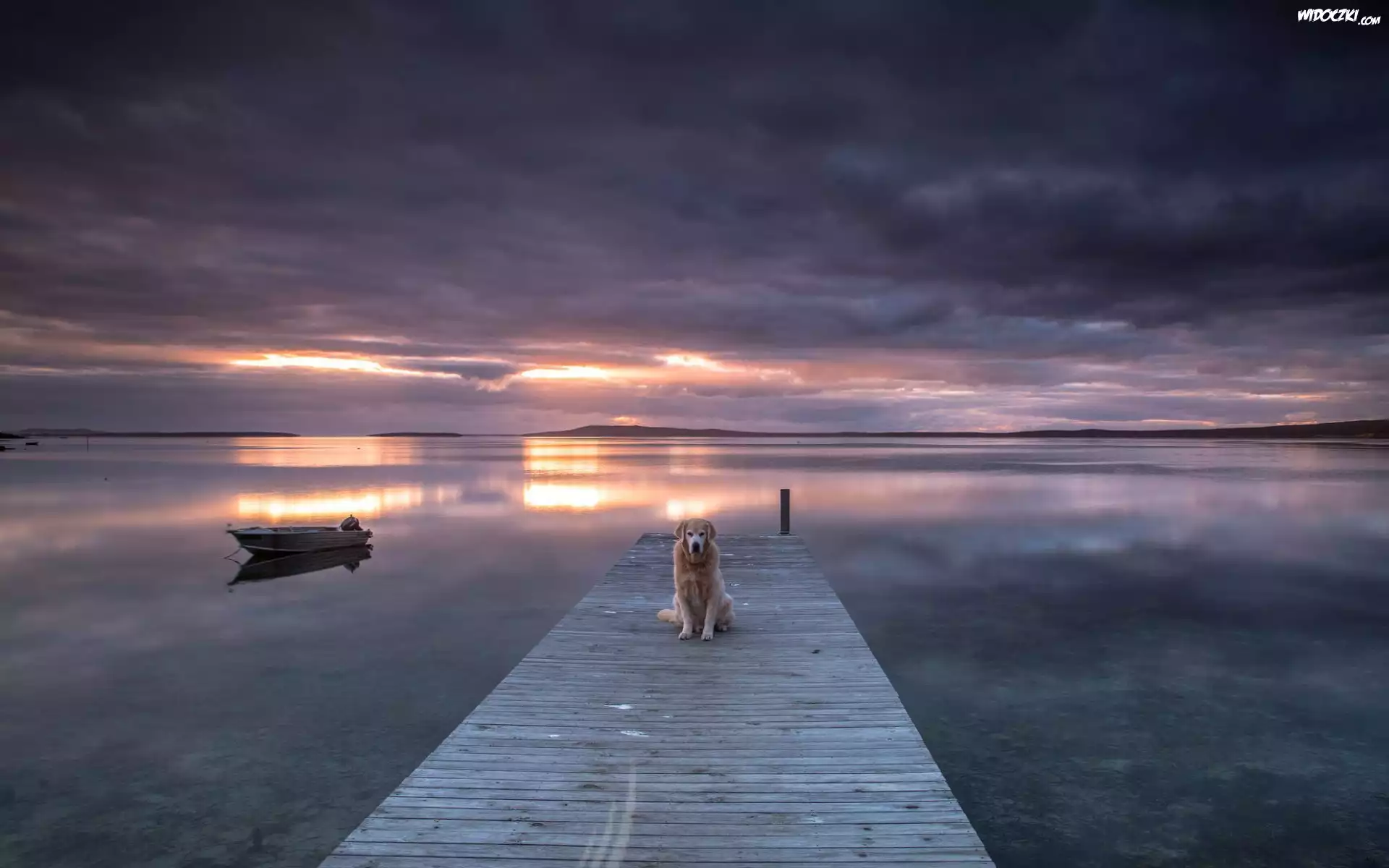 Zdjęcia, Morze, Pies, Łódka, Zachód słońca