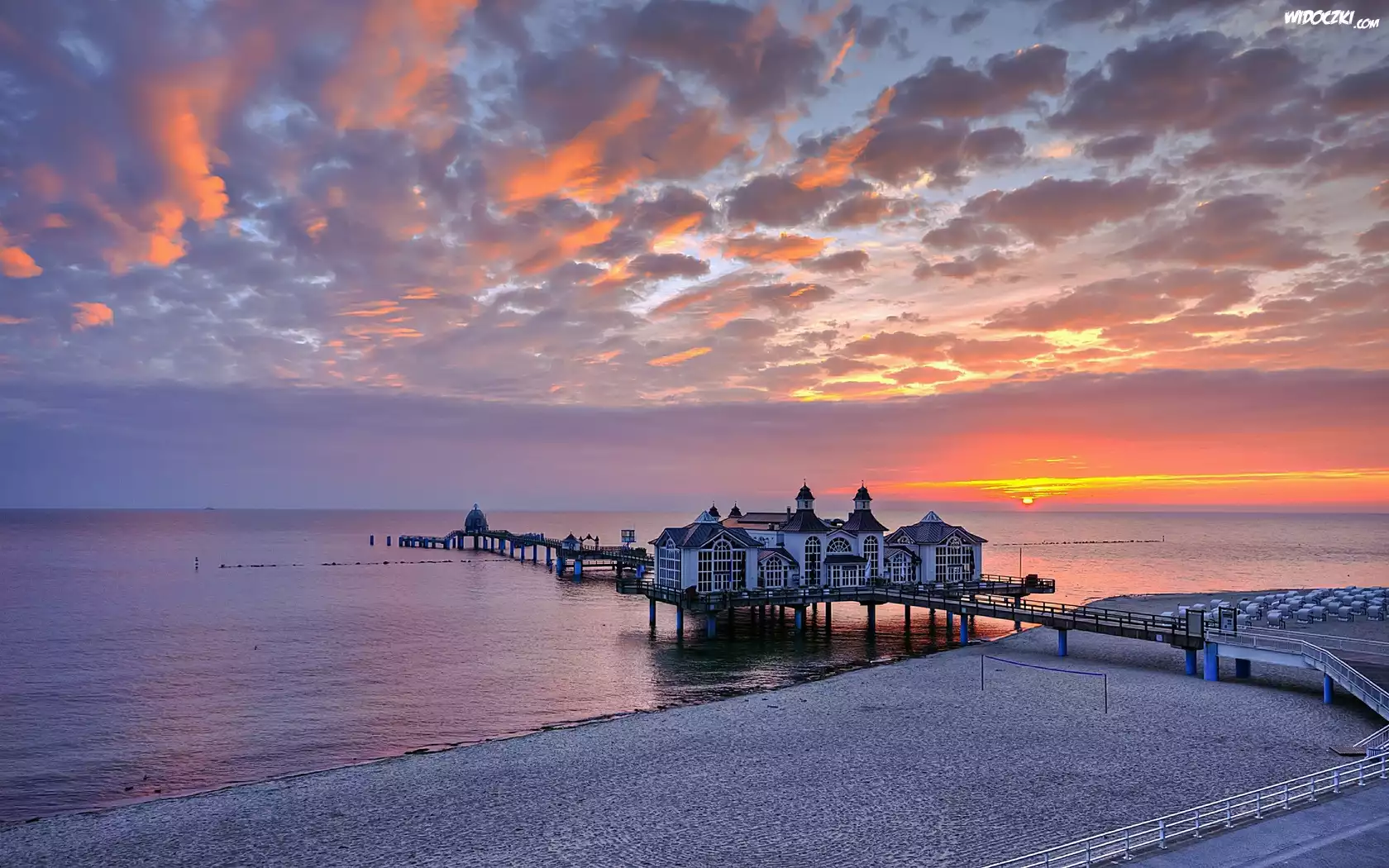 Morze, Plaża, Pomost, Domy, Zachód Słońca