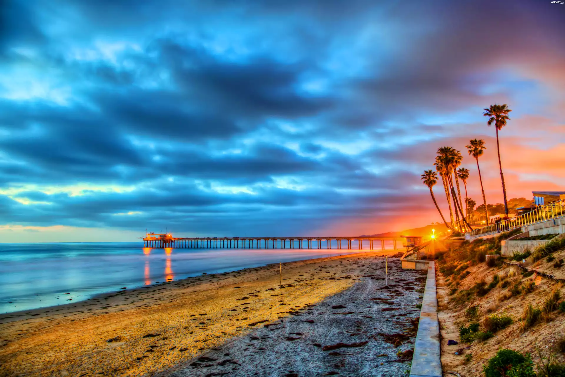 Zdjęcia, Morze, Plaża, Pomost, Zachód Słońca