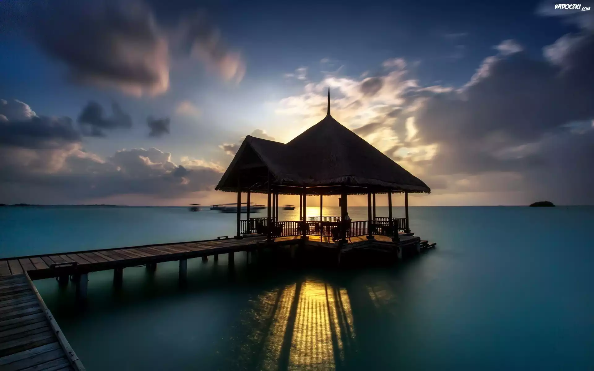 Zdjęcia, Morze, Statki, Pomost, Zachód, Słońca