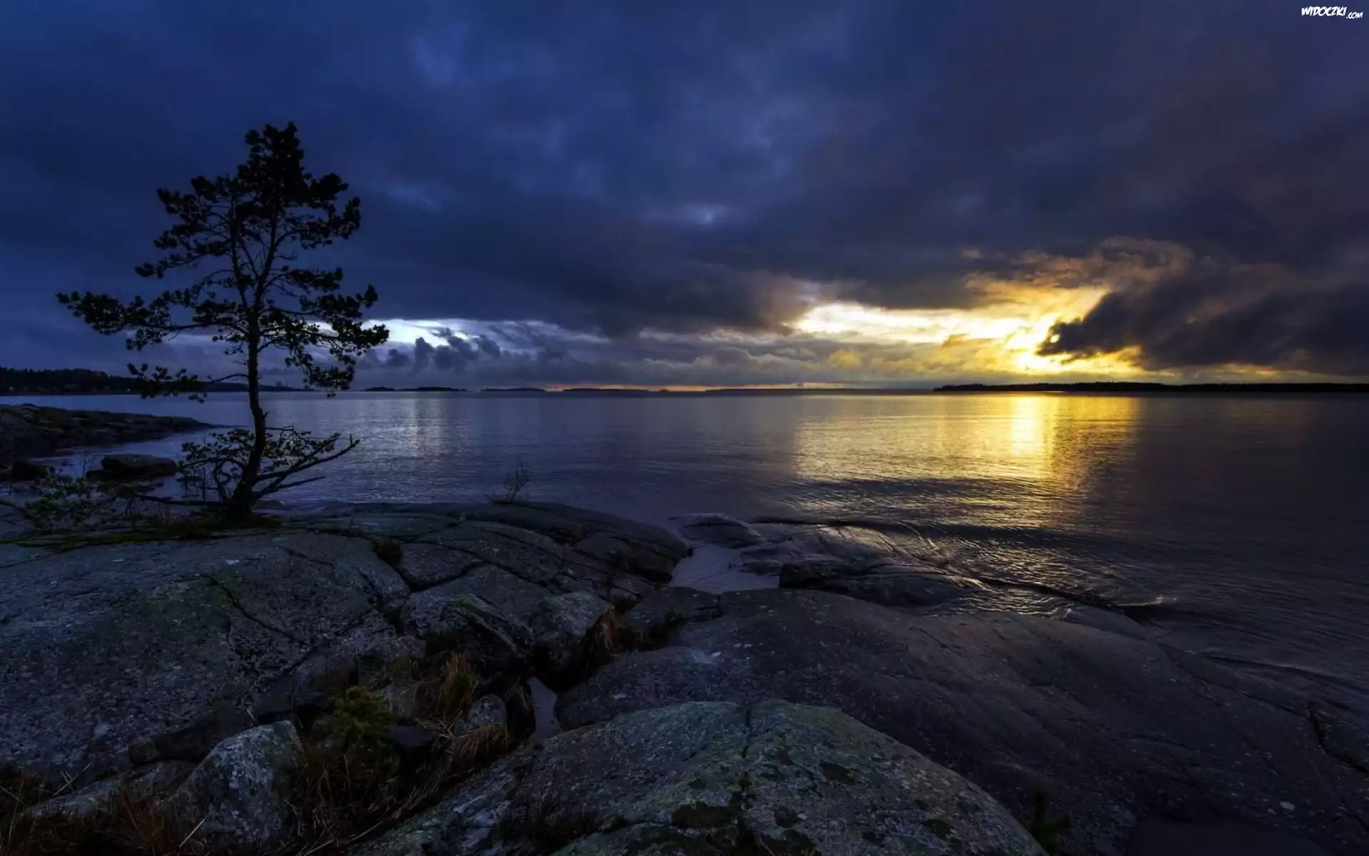 Zdjęcia, Morze, Drzewo, Skały, Chmury, Zachód, Słońca