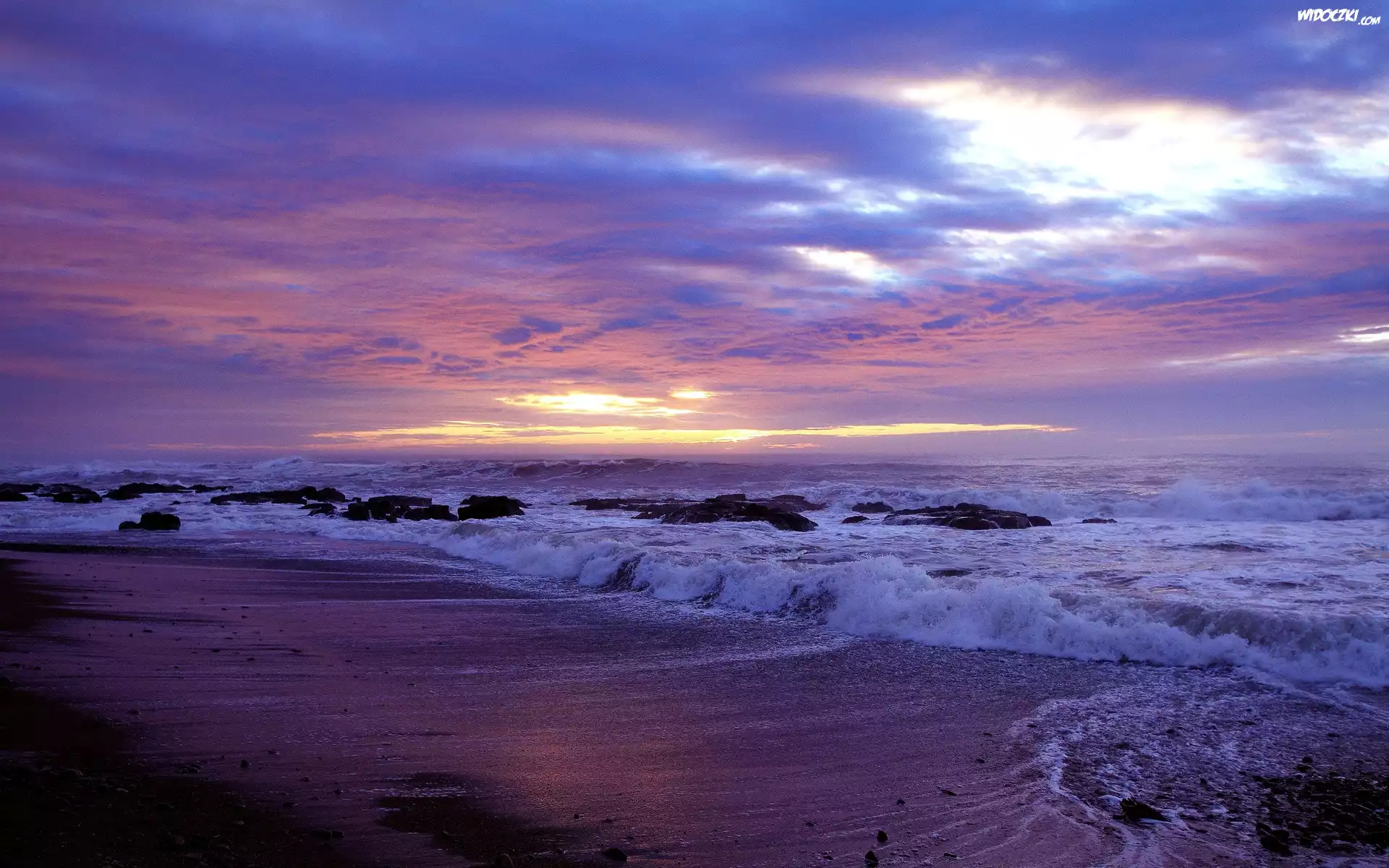 Zdjęcia, Morze, Fale, Skały, Zachód, Słońca