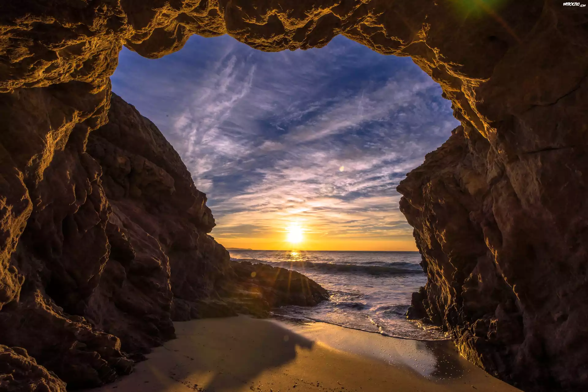 Zdjęcia, Morze, Jaskinia, Skały, Zachód Słońca