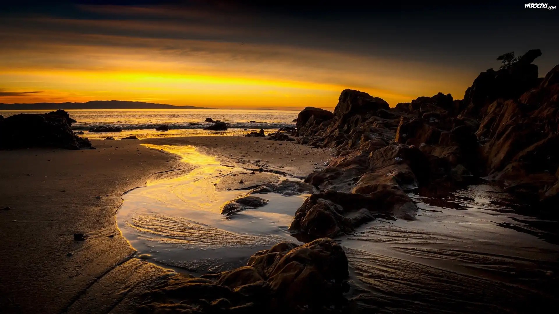 Morze, Plaża, Skały, Zachód słońca